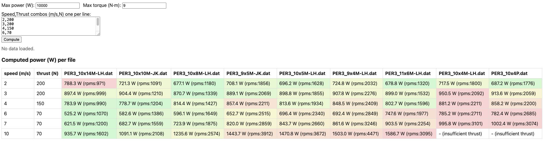 I used the data from APC website to calculate theoretical power draw for different props at different speeds and different thrust levels. This is not counting the electric motor and ESC inefficiencies.