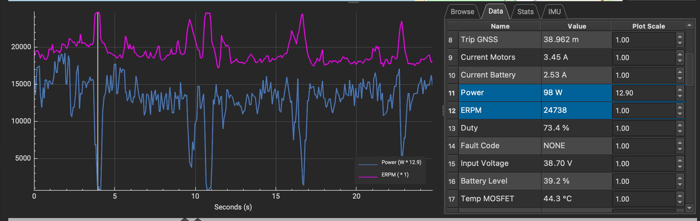 Here’s a VESC log visualizing the ERPM and Power where you can clearly see when the prop ventilated because the ERPM spikes and the Power (Watts) is going way down: