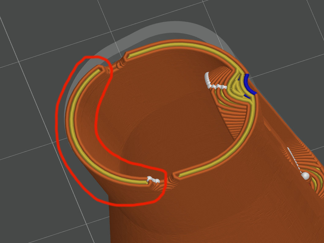 The connection of the lower part of the inner handle and the rest is just 1-2cm with barely any thickness (for me 3 lines of 0.42mm) and is aligned right with the layer lines.