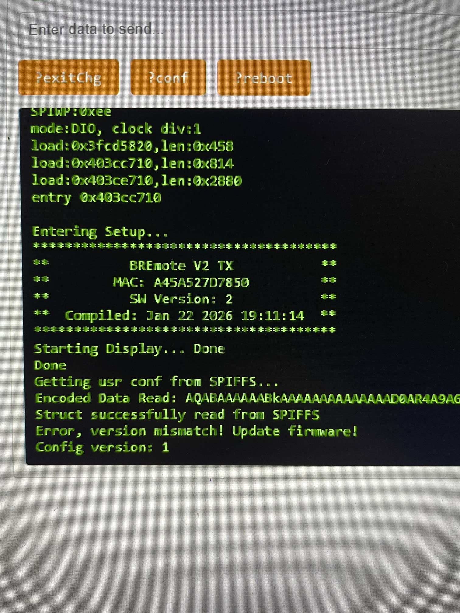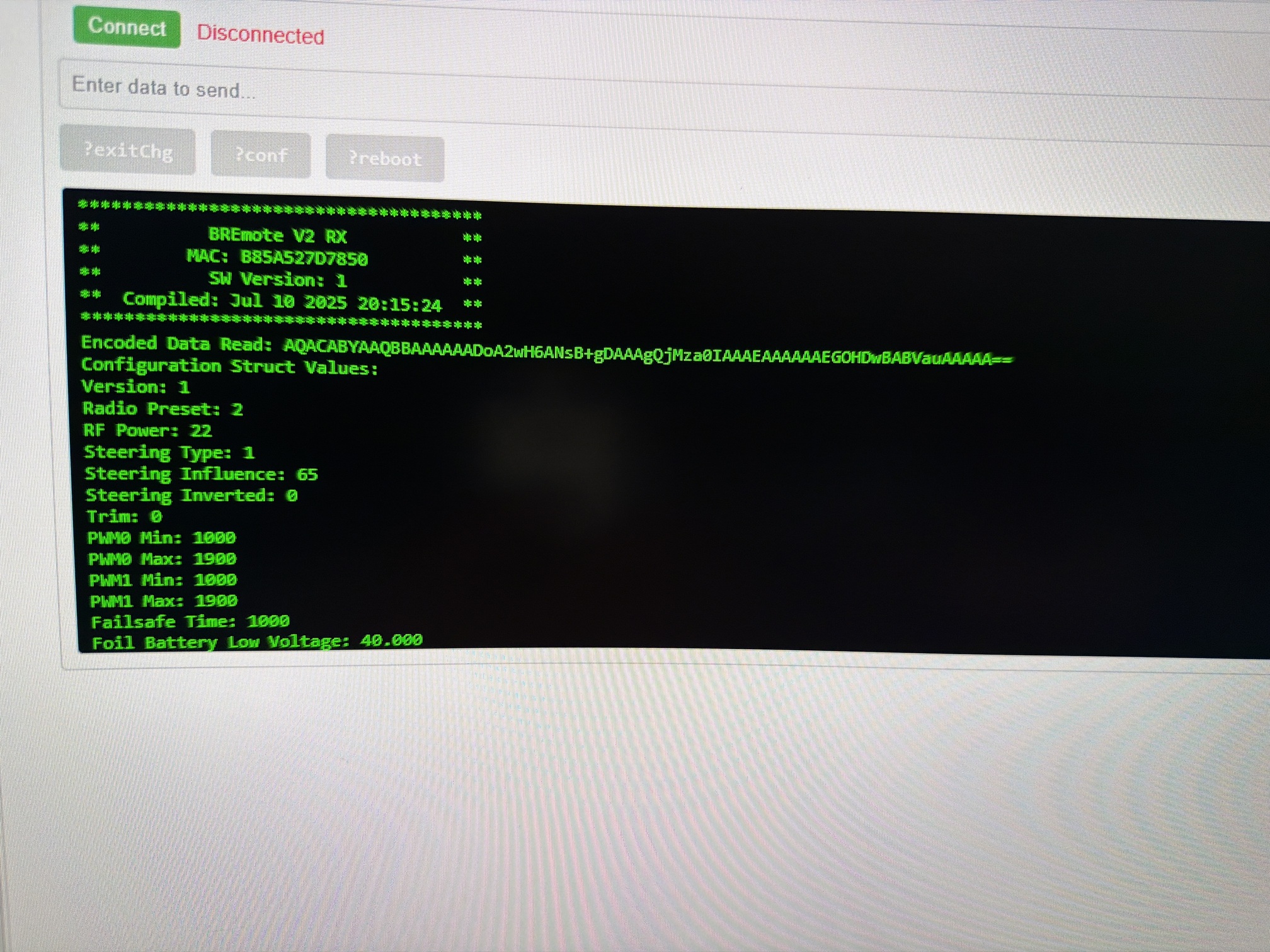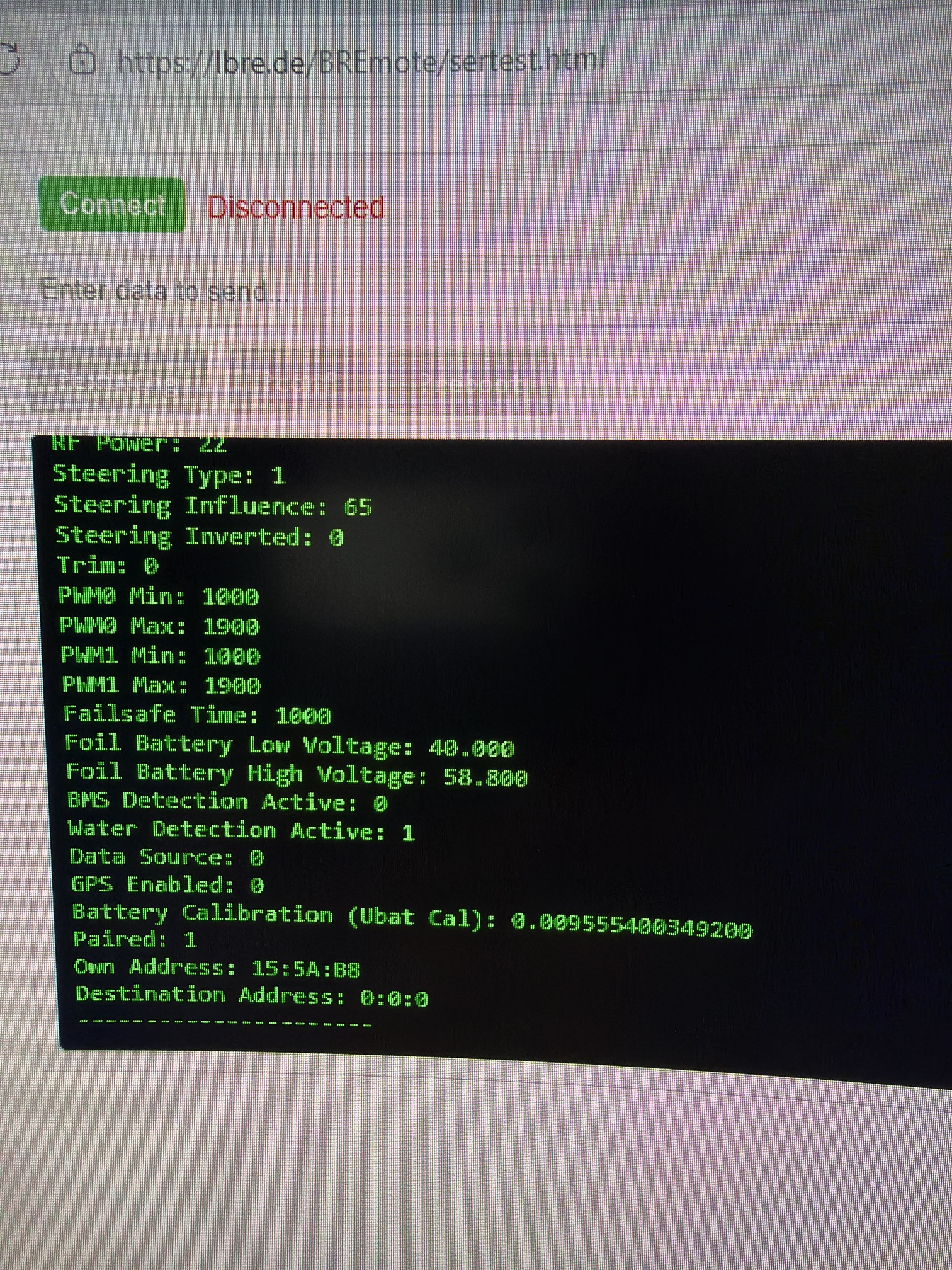 i recently finish my bi-motor to with a second hand (brand new) bremote v2…and I really enjoy it for the first 5/6 sessions…and on rhe last my tx miss the connection at the end…when i shut down and restart her the led was less flashy and write: ECH…so i think it was a corrosion on the magnet system…so i try to upgrade the firmware to fix the pb (and i also clean connections…)