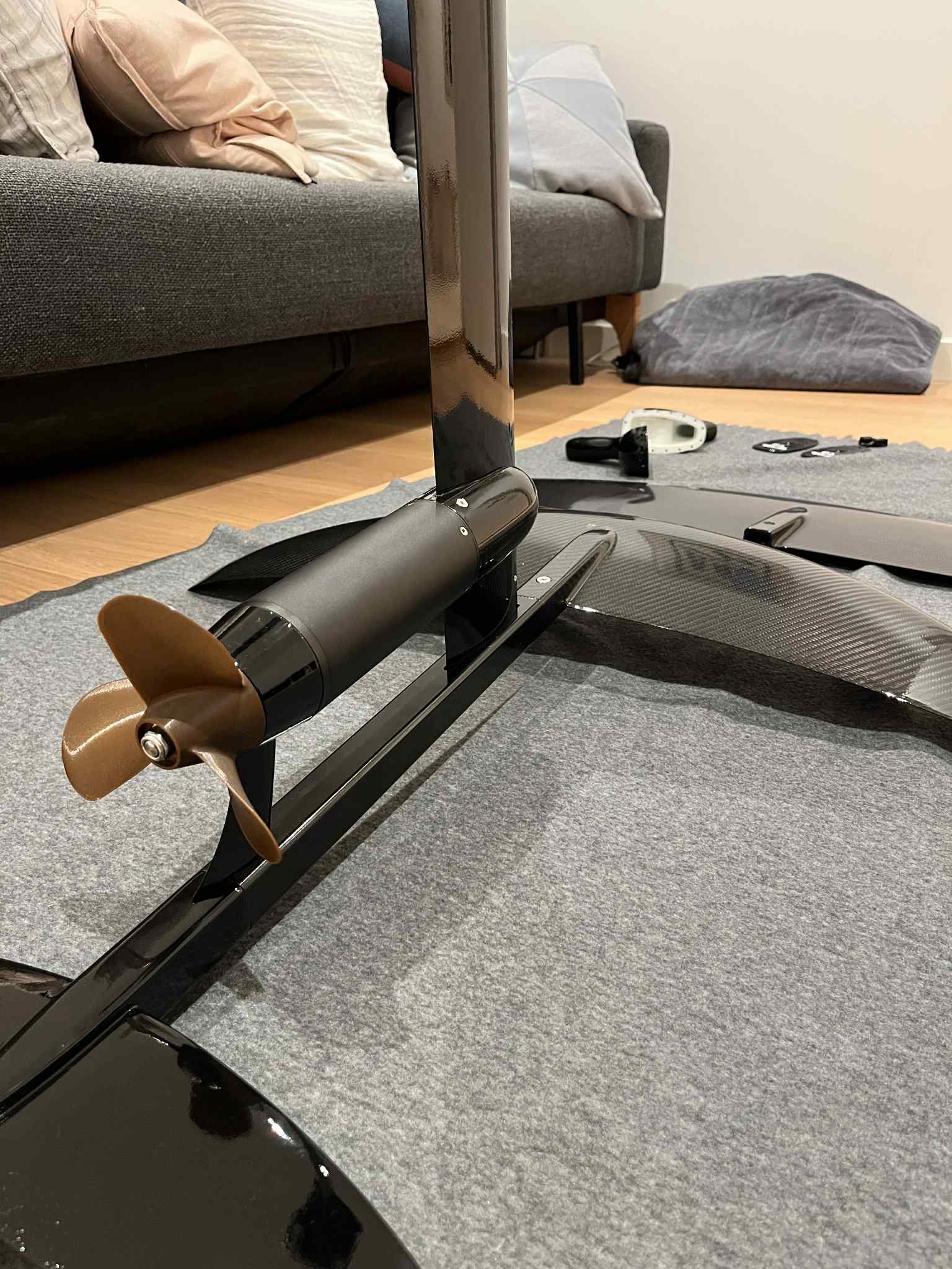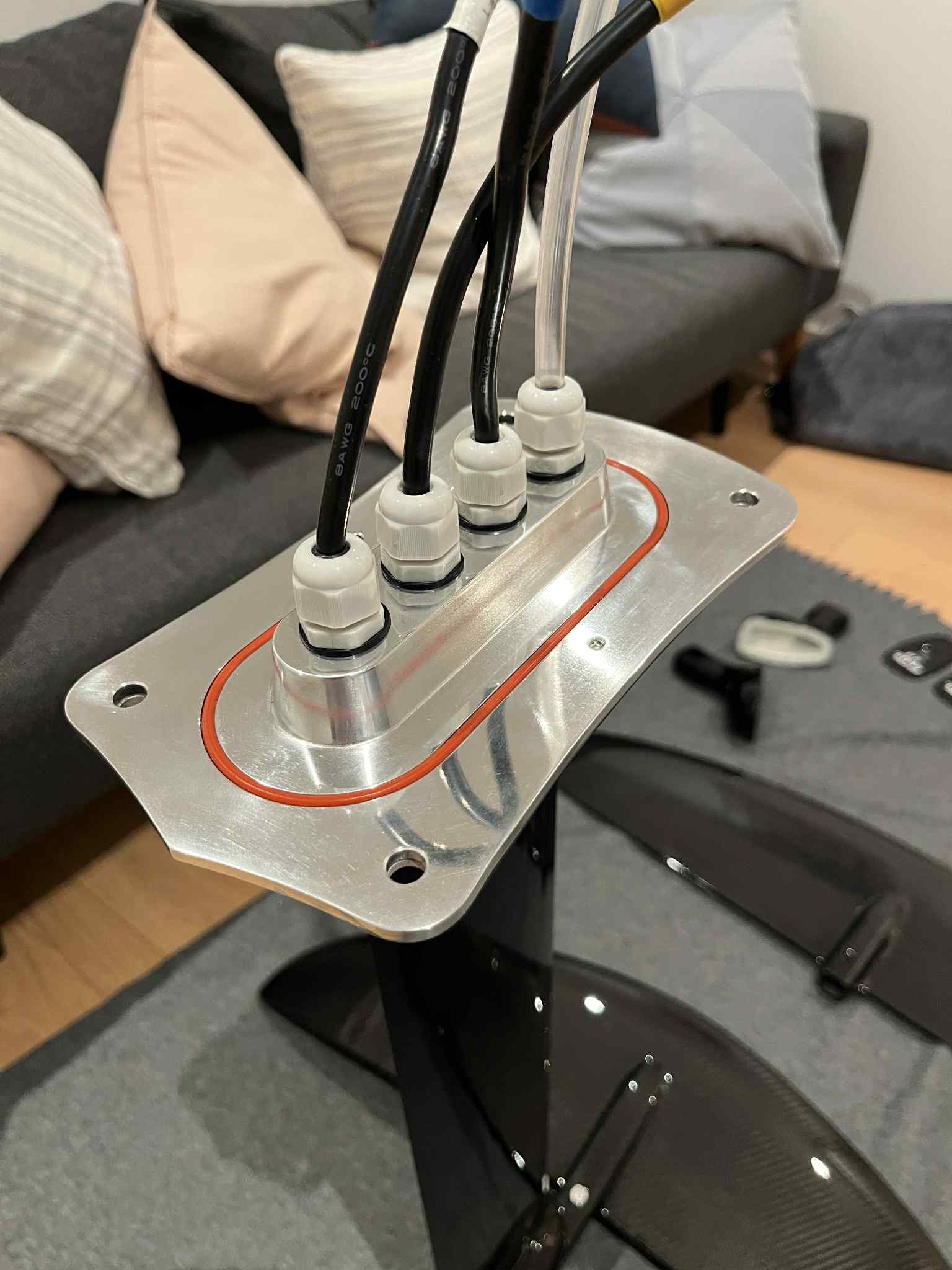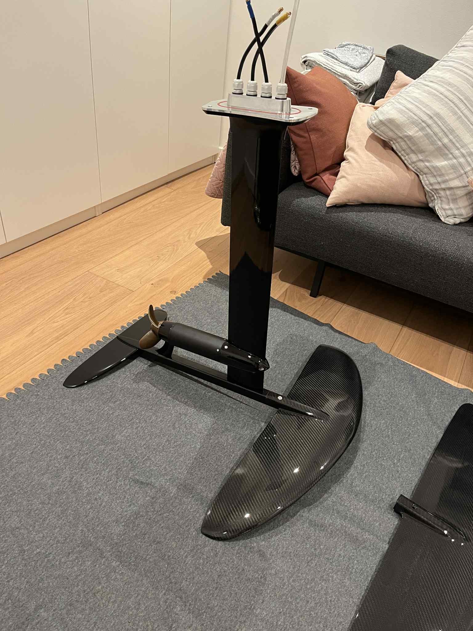 I use a 700mm GONG V1 mast with V1 fuselage and a V1 1350cm2 front wing and 400cm2 rear stabilizer. These were sanded and painted with an automotive 2-part clearcoat or glossy powder coat. The motor is mounted to the mast with a 3d printed motor plate, and a CNC milled aluminum front mount. These are clamped around the mast with a TPU 3D printed shim. The interface plate between the mast plate and the board is also CNC milled aluminum with a silicone O-ring and cable glands. Both were made by JLCCNC.