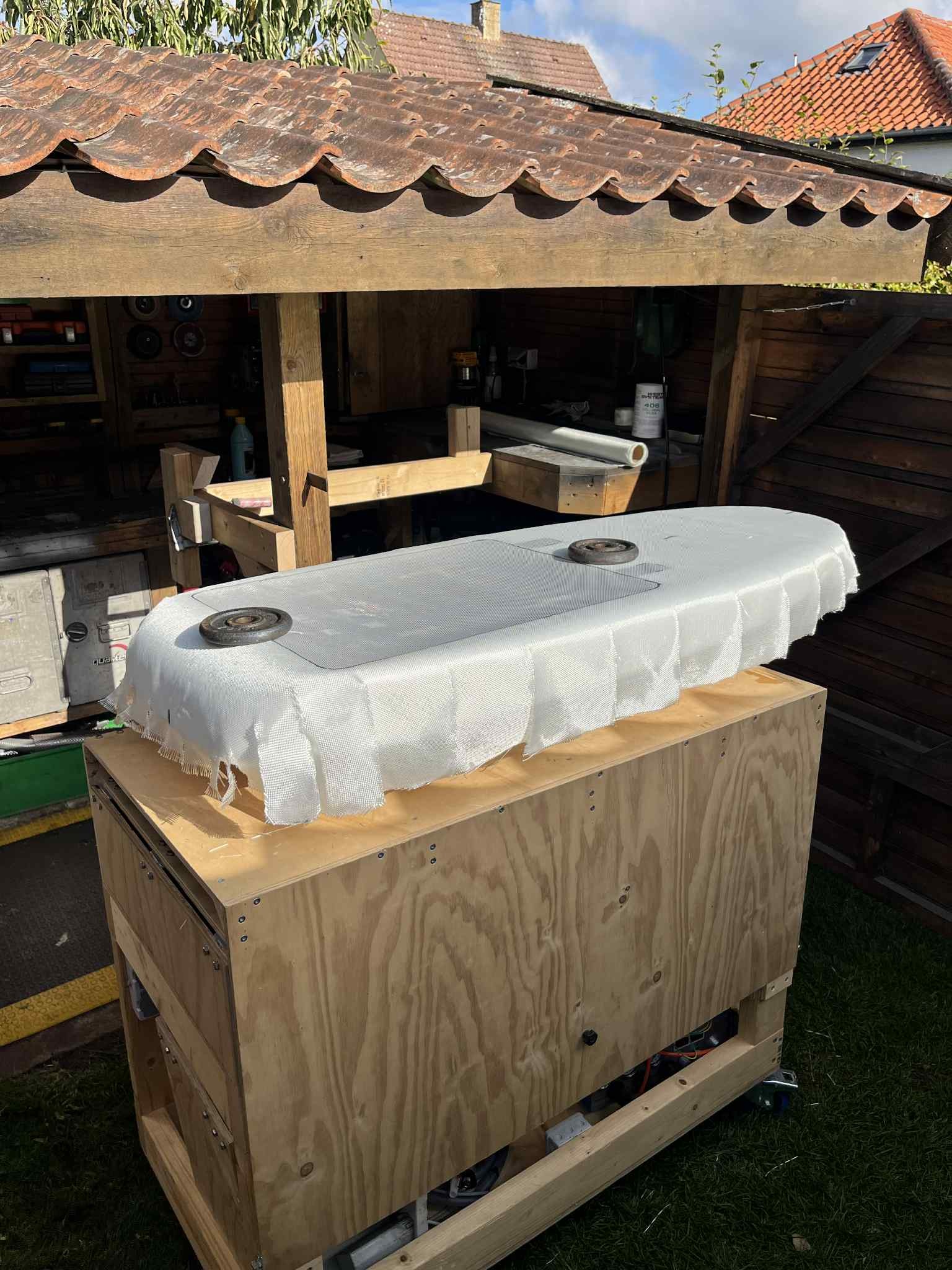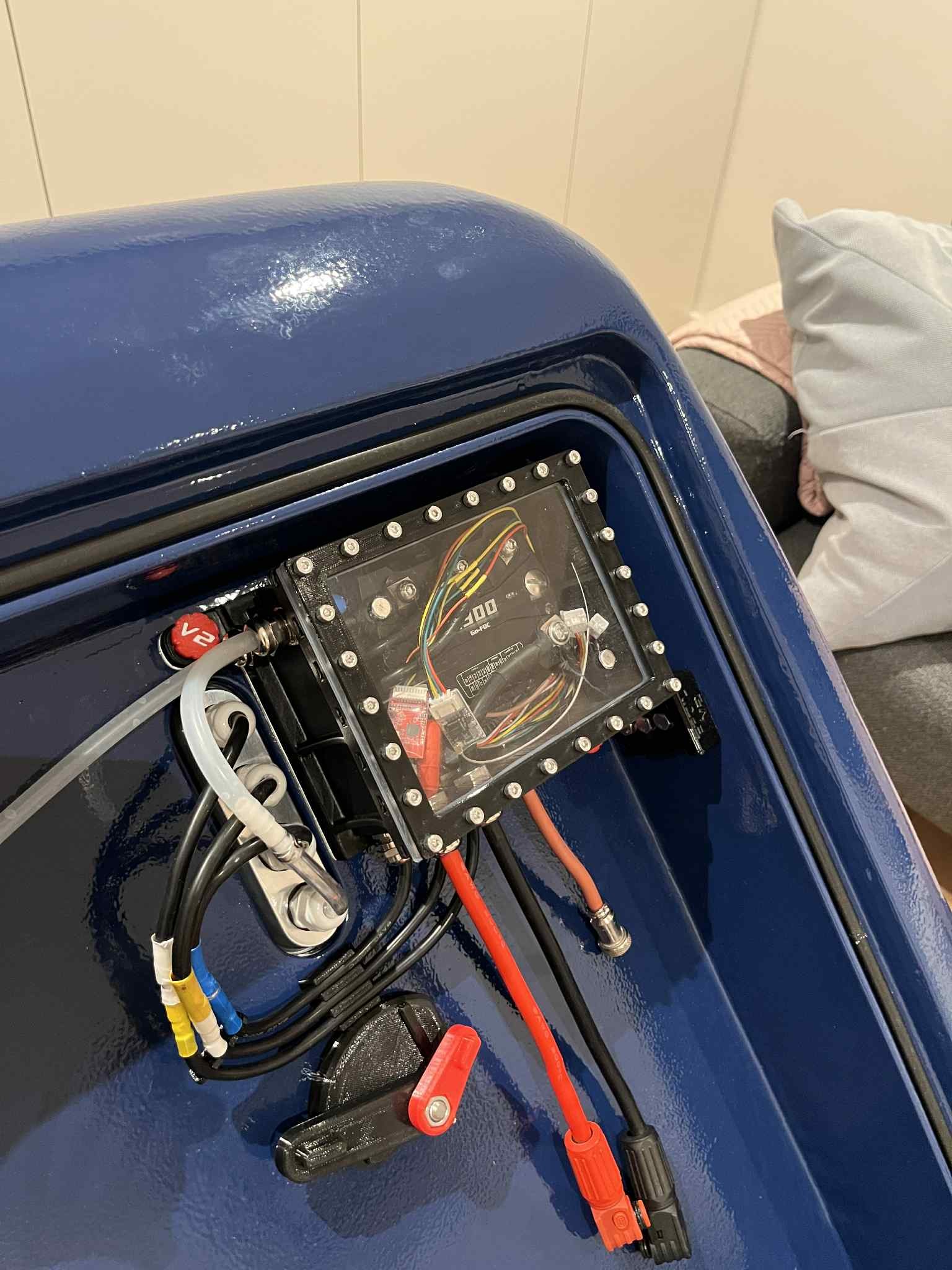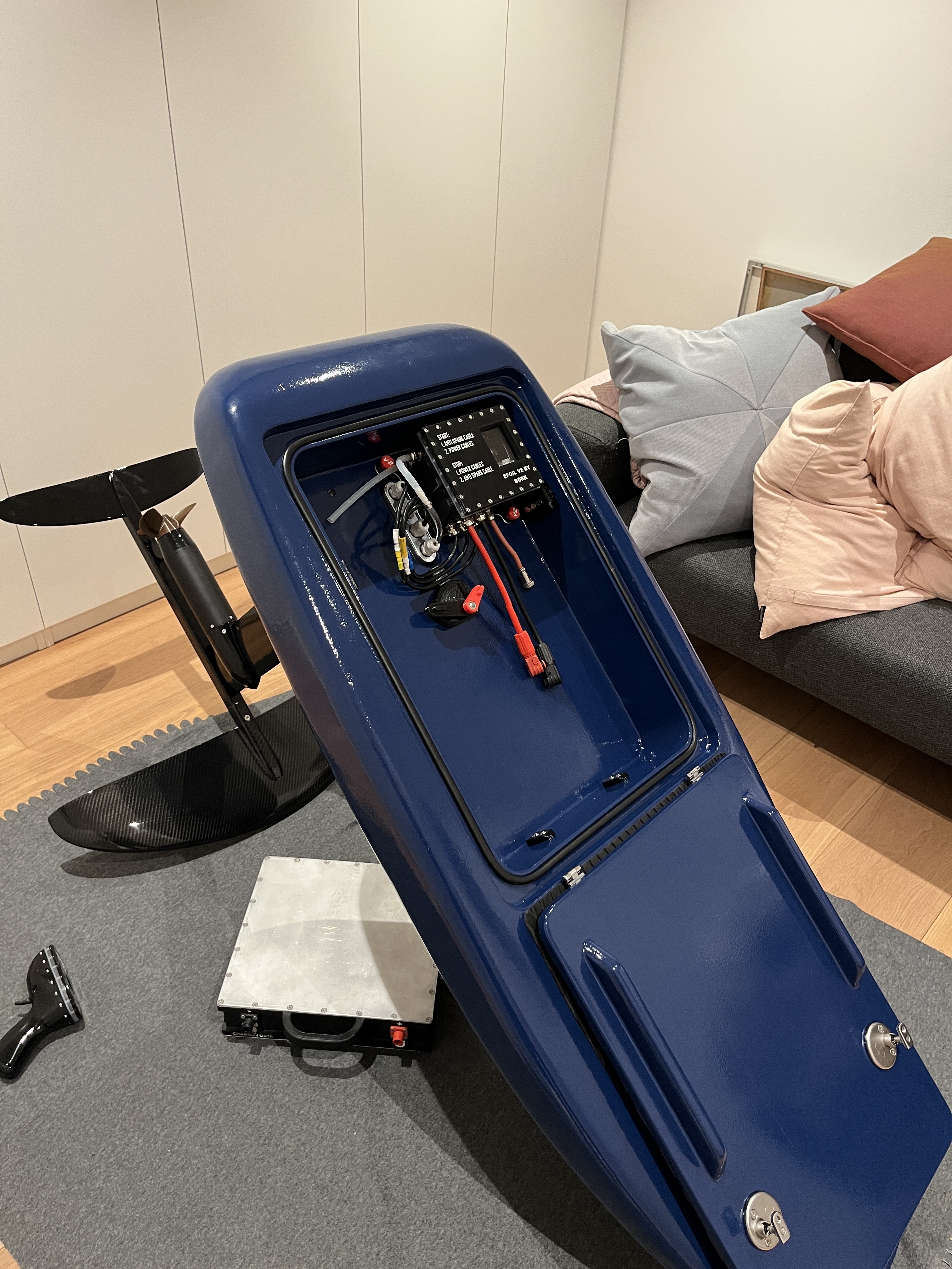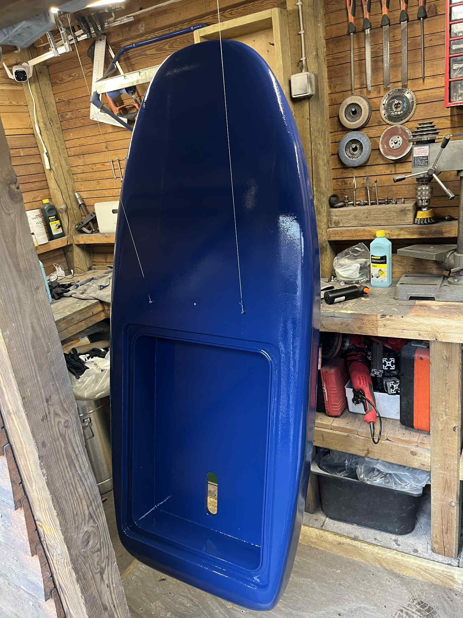 After cutting the rough shape, I used a handheld router to carve out the insert for the hatch and the wooden piece underneath the board, where the battery, VESC and mast later were mounted to. As sharp edges are difficult to warp fiberglass around, I cut a fillet on all these edges filled them with thickened epoxy before glassing. I glued a 12mm plywood board from birch to the underside, to give the board extra strength where the mast mounts to the board. Using a orbital sander and grinder with sanding discs, I shaped the board to the final shape. Before glassing I added solid 3D-printed PETG block, where woodscrews later can be used to mount hatch, battery etc. Don’t use PLA, as it will soften when exposed to the heat of the sun. When glassing to an edge, I found it easier to do one surface at a time. Although more time consuming, it is the only way to get a sharp edge without vacuum bagging or infusion. It is very important to prep the surfaces with low grid sandpaper and wiped with IPA where cured layup meets wet, as this bond relies purely on surface adherence and not chemically bonded. After this I could start glassing the entire board. I found from previous experience that 2 layers on both sides with 300g/m2 was insufficient and was easily dented when hitting the dock. This time I used 4 layers (300g) top and bottom, giving 8 layers on the sides where they overlap. This is plenty strong and will last forever. I was using PETG inserts where bolt for mounting the mast will go through the plywood. To avoid water from leaking into the wood, these solid plastic pieces will prevent this. The hatch was made from same plywood, but with small wooden braces to stiffen the hatch. Earlier experience taught me that the hatch must be very stiff, to keep a good seal against the board. I painted the board with a 2-part polyurethane paint made by Hempel (Polygloss in cobalt blue).