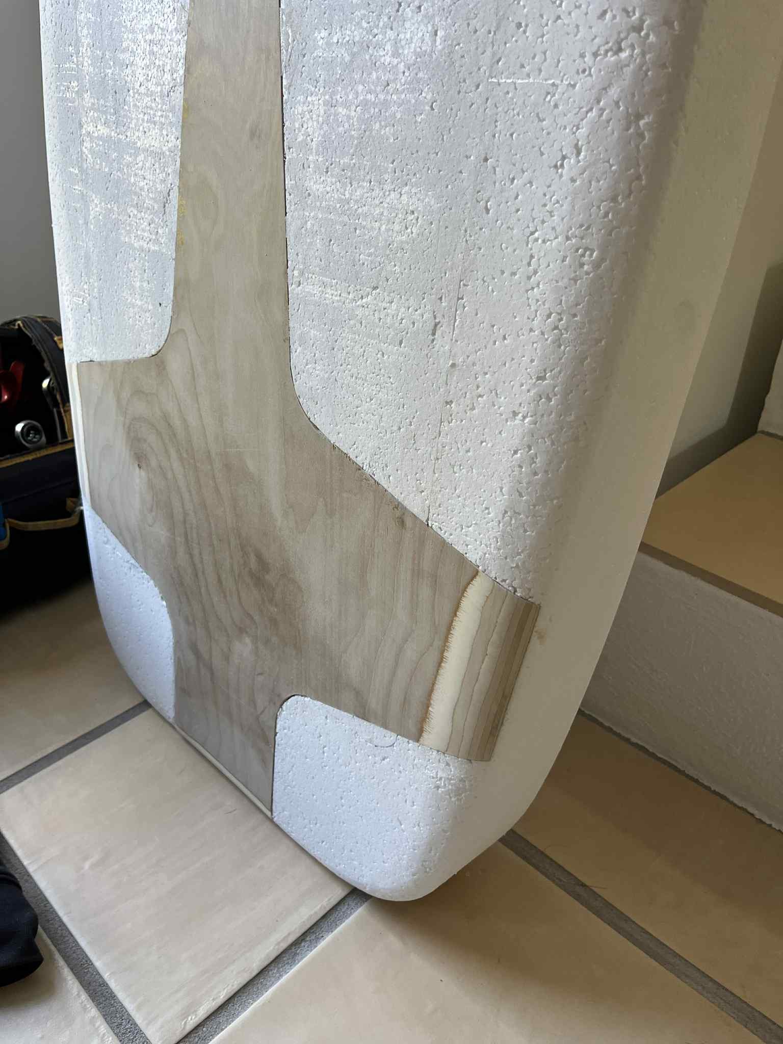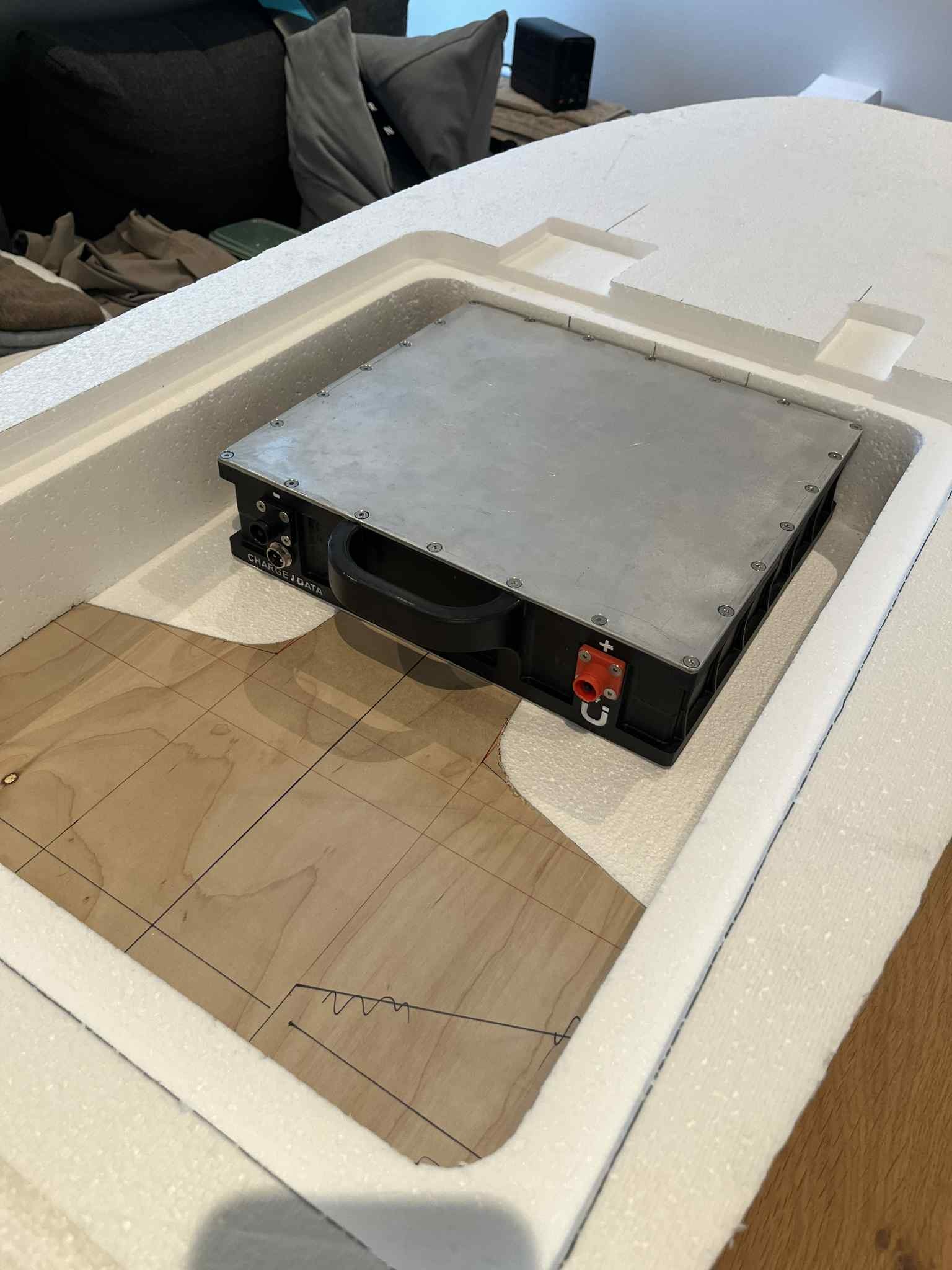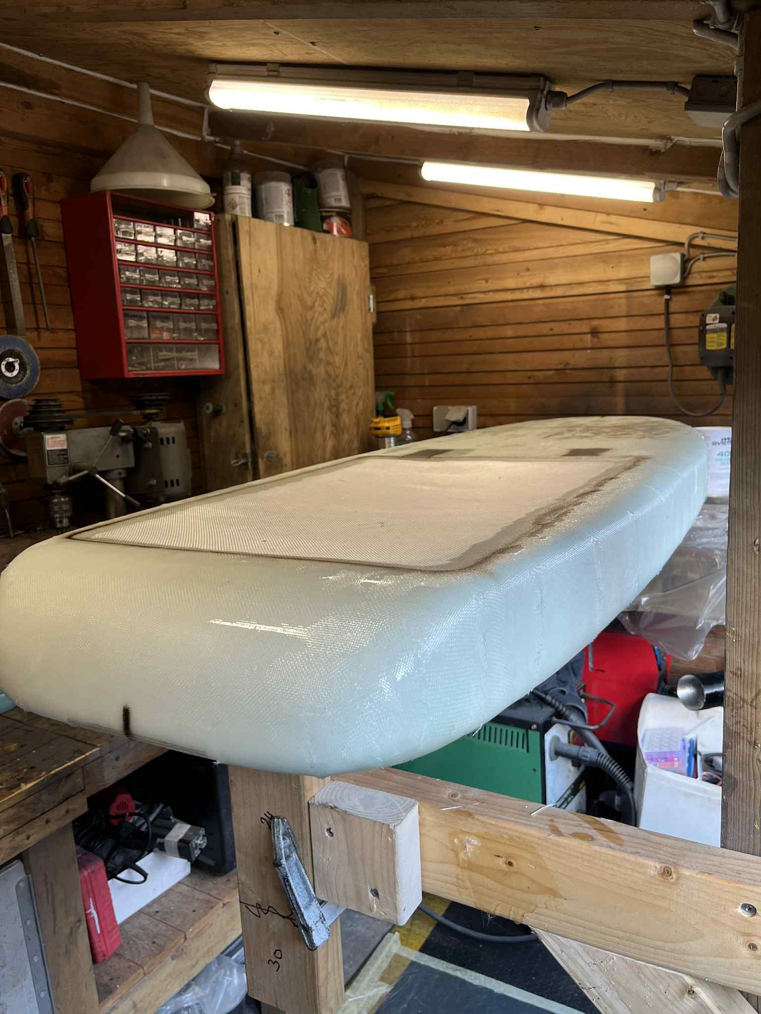 After cutting the rough shape, I used a handheld router to carve out the insert for the hatch and the wooden piece underneath the board, where the battery, VESC and mast later were mounted to. As sharp edges are difficult to warp fiberglass around, I cut a fillet on all these edges filled them with thickened epoxy before glassing. I glued a 12mm plywood board from birch to the underside, to give the board extra strength where the mast mounts to the board. Using a orbital sander and grinder with sanding discs, I shaped the board to the final shape. Before glassing I added solid 3D-printed PETG block, where woodscrews later can be used to mount hatch, battery etc. Don’t use PLA, as it will soften when exposed to the heat of the sun. When glassing to an edge, I found it easier to do one surface at a time. Although more time consuming, it is the only way to get a sharp edge without vacuum bagging or infusion. It is very important to prep the surfaces with low grid sandpaper and wiped with IPA where cured layup meets wet, as this bond relies purely on surface adherence and not chemically bonded. After this I could start glassing the entire board. I found from previous experience that 2 layers on both sides with 300g/m2 was insufficient and was easily dented when hitting the dock. This time I used 4 layers (300g) top and bottom, giving 8 layers on the sides where they overlap. This is plenty strong and will last forever. I was using PETG inserts where bolt for mounting the mast will go through the plywood. To avoid water from leaking into the wood, these solid plastic pieces will prevent this. The hatch was made from same plywood, but with small wooden braces to stiffen the hatch. Earlier experience taught me that the hatch must be very stiff, to keep a good seal against the board. I painted the board with a 2-part polyurethane paint made by Hempel (Polygloss in cobalt blue).