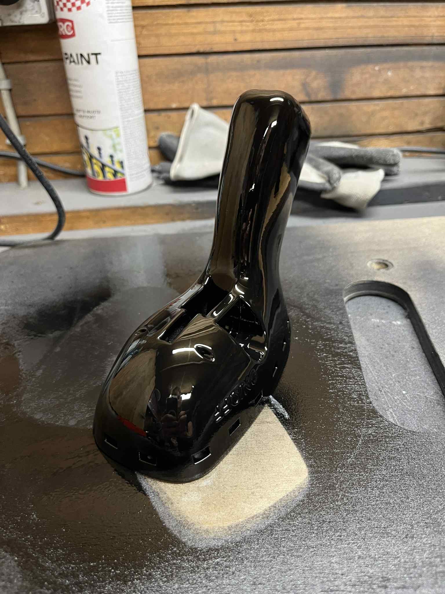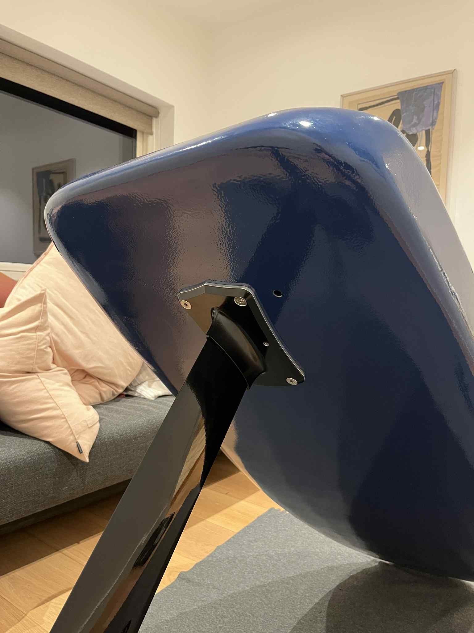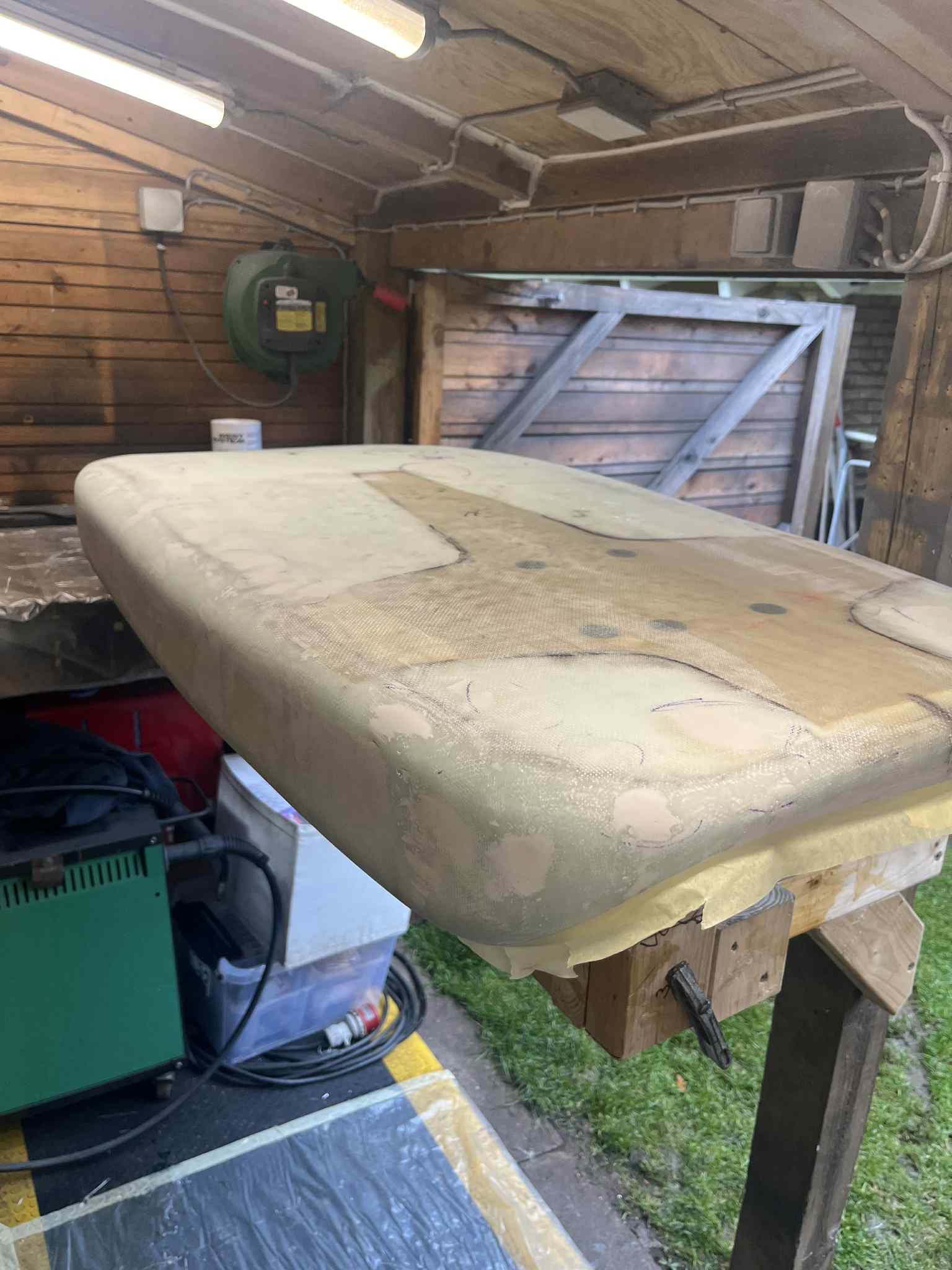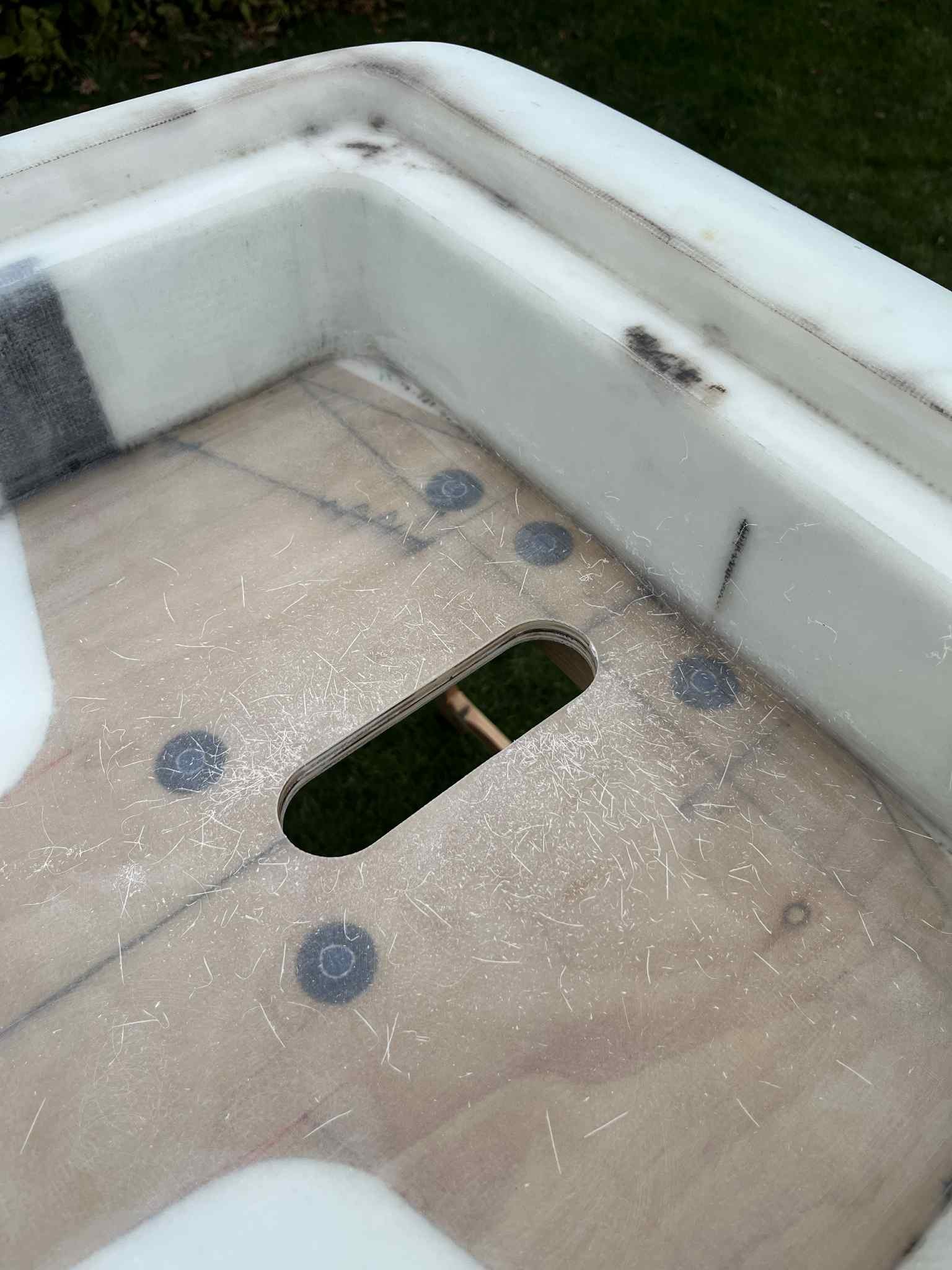 After cutting the rough shape, I used a handheld router to carve out the insert for the hatch and the wooden piece underneath the board, where the battery, VESC and mast later were mounted to. As sharp edges are difficult to warp fiberglass around, I cut a fillet on all these edges filled them with thickened epoxy before glassing. I glued a 12mm plywood board from birch to the underside, to give the board extra strength where the mast mounts to the board. Using a orbital sander and grinder with sanding discs, I shaped the board to the final shape. Before glassing I added solid 3D-printed PETG block, where woodscrews later can be used to mount hatch, battery etc. Don’t use PLA, as it will soften when exposed to the heat of the sun. When glassing to an edge, I found it easier to do one surface at a time. Although more time consuming, it is the only way to get a sharp edge without vacuum bagging or infusion. It is very important to prep the surfaces with low grid sandpaper and wiped with IPA where cured layup meets wet, as this bond relies purely on surface adherence and not chemically bonded. After this I could start glassing the entire board. I found from previous experience that 2 layers on both sides with 300g/m2 was insufficient and was easily dented when hitting the dock. This time I used 4 layers (300g) top and bottom, giving 8 layers on the sides where they overlap. This is plenty strong and will last forever. I was using PETG inserts where bolt for mounting the mast will go through the plywood. To avoid water from leaking into the wood, these solid plastic pieces will prevent this. The hatch was made from same plywood, but with small wooden braces to stiffen the hatch. Earlier experience taught me that the hatch must be very stiff, to keep a good seal against the board. I painted the board with a 2-part polyurethane paint made by Hempel (Polygloss in cobalt blue).