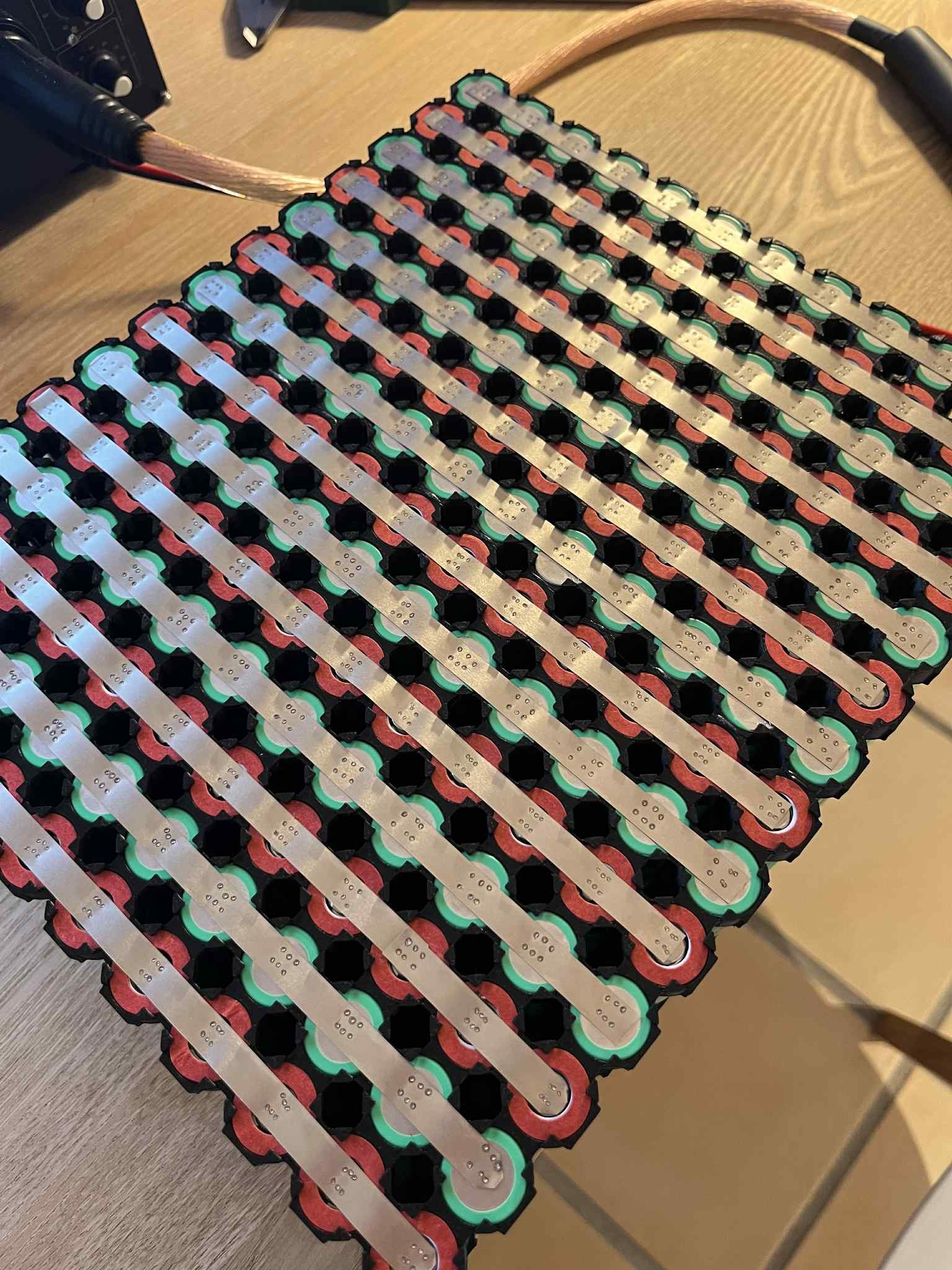 The battery is made from 168 lithium-ion batteries. This gives a 14s battery with 12 in parallel, giving a 1,5kWh capacity at 50,4 V nominal and 58,8 V maximum. It was spotwelded with pure nickel strips. It is important to add a fuse as close to the battery as possible. I mounted the fuse inside the battery, although I guess it would be alright outside too. I used a BMS for charging and bypassed when discharging. Although some prefer to discharge through the BMS, it then requires a bigger and more expensive BMS. I have not had a single problem, and all cells are always ± 0,005V to each other. The case is 3D printed in PETG, with M4 threaded inserts to screw the 2mm aluminum plate to each side. The inside is coated with thickened epoxy and sealed with silicone between the plastic and aluminum.