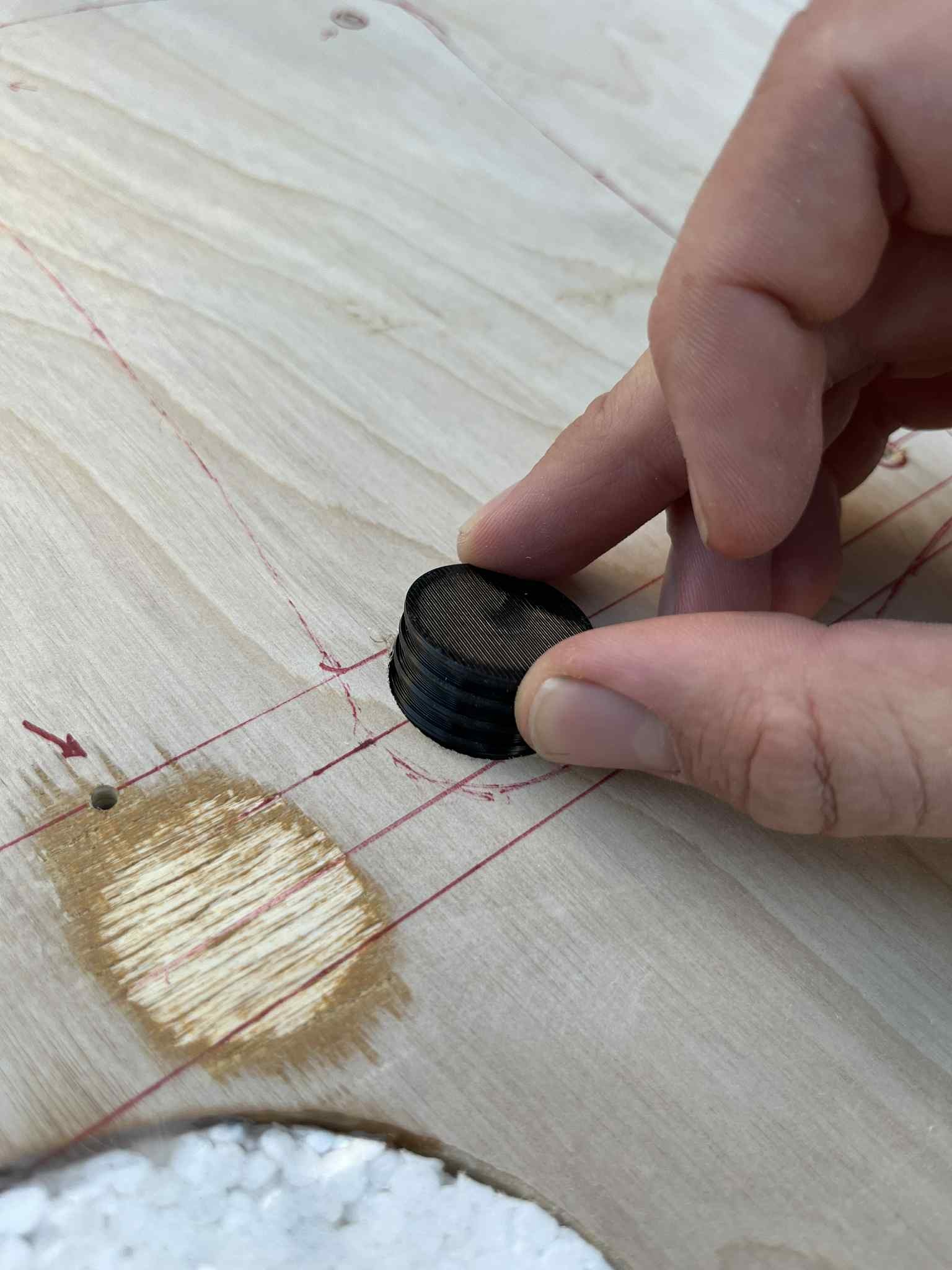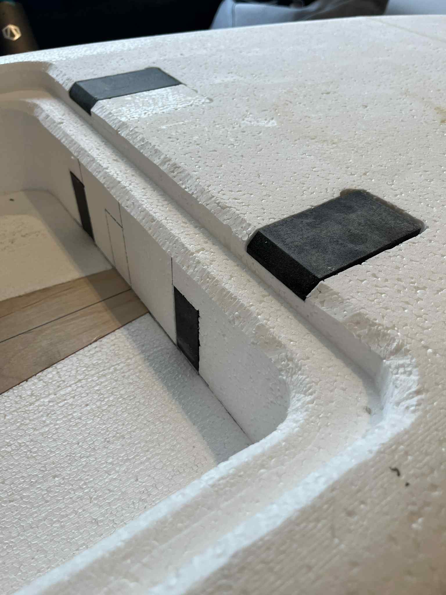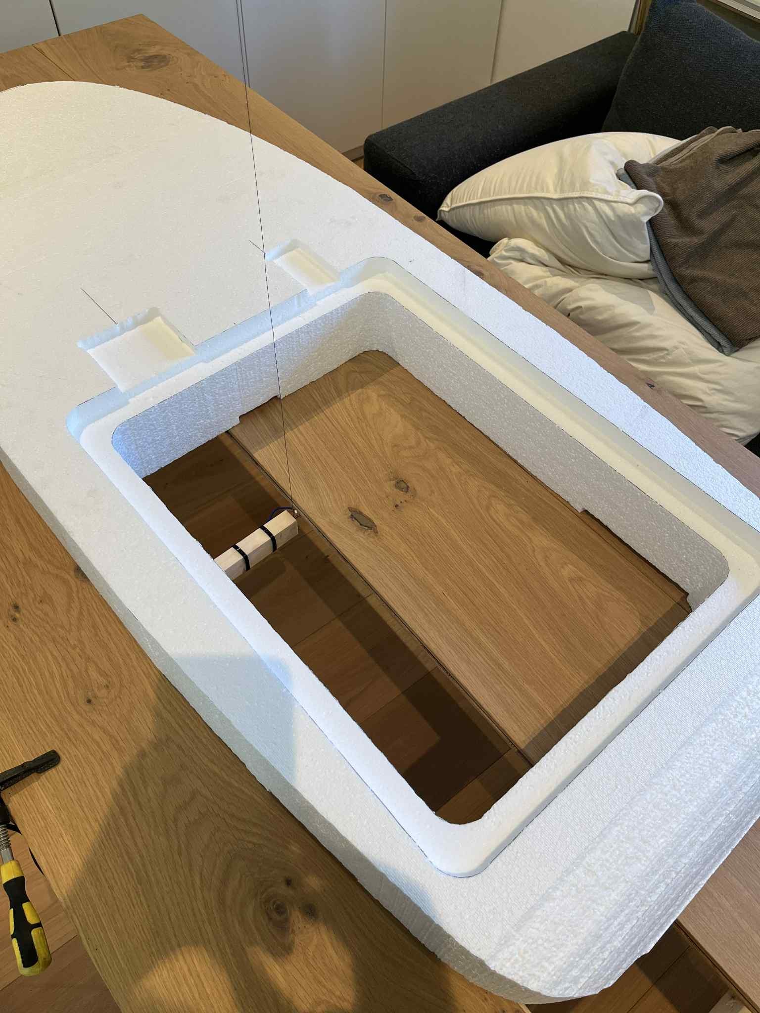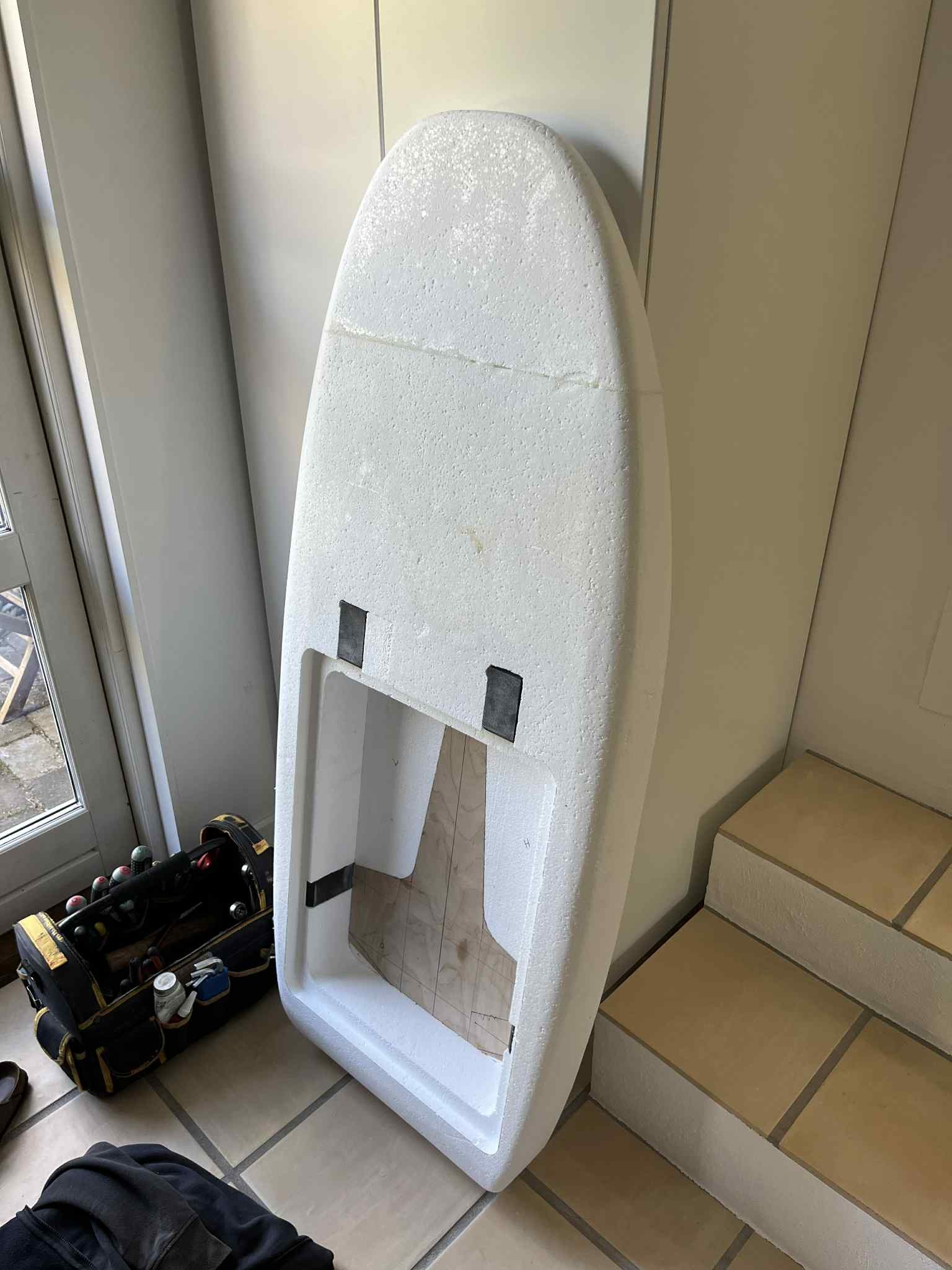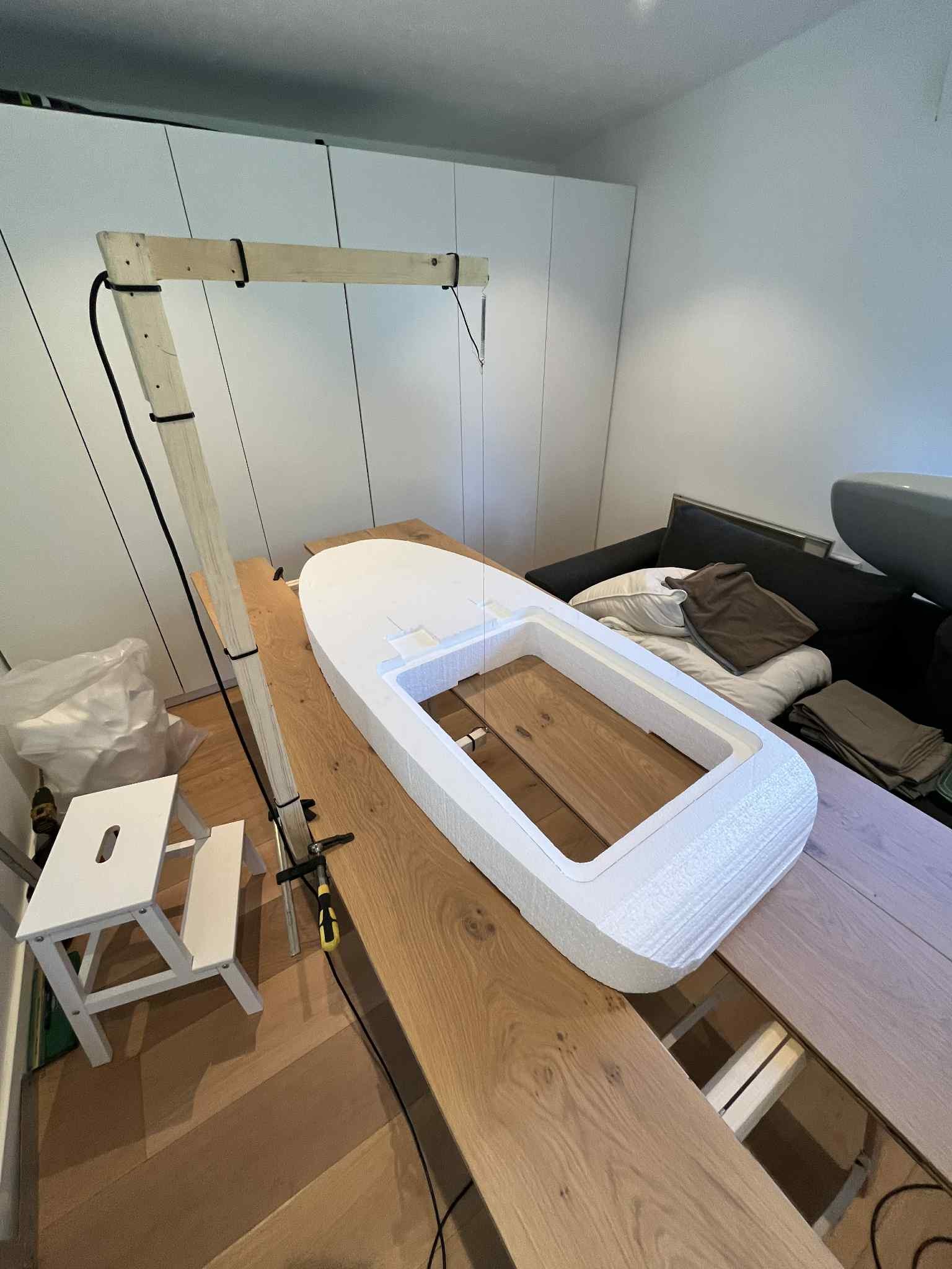 The Efoil was made from EPS insulation and cut using a hot nichrome wire mounted both parallel and perpendicular to a flat table. If available, I would choose XPS, as EPS soaks a lot of epoxy later. By printing a 1:1 template from fusion 360 on multiple pieces of A4 paper, it was easy to guide the wire cutter against the template.