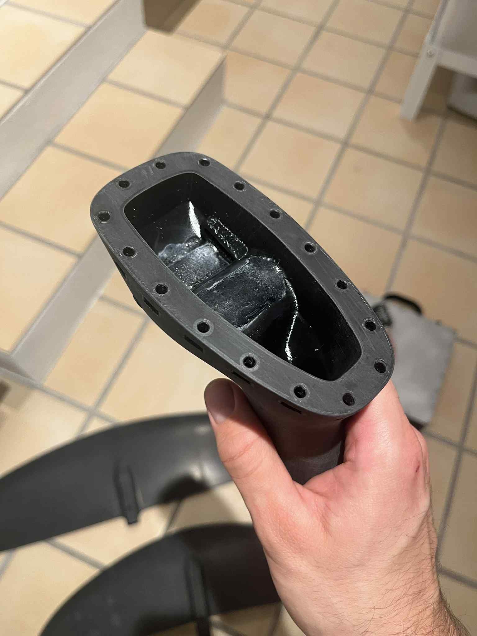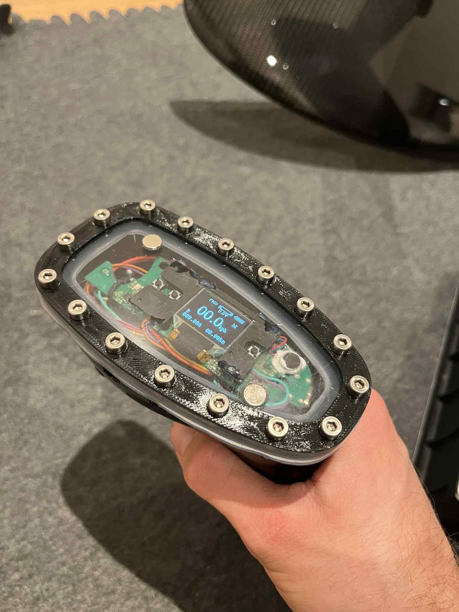 The remote is made the same way as the VESC box and has also never leaked. The design is one I found elsewhere but redesigned it to have thicker walls and to fit the remote PCB. By using a hall effect sensor with magnets outside the remote, the remote stays waterproof. This uses one single lithium cell from the Efoil battery.