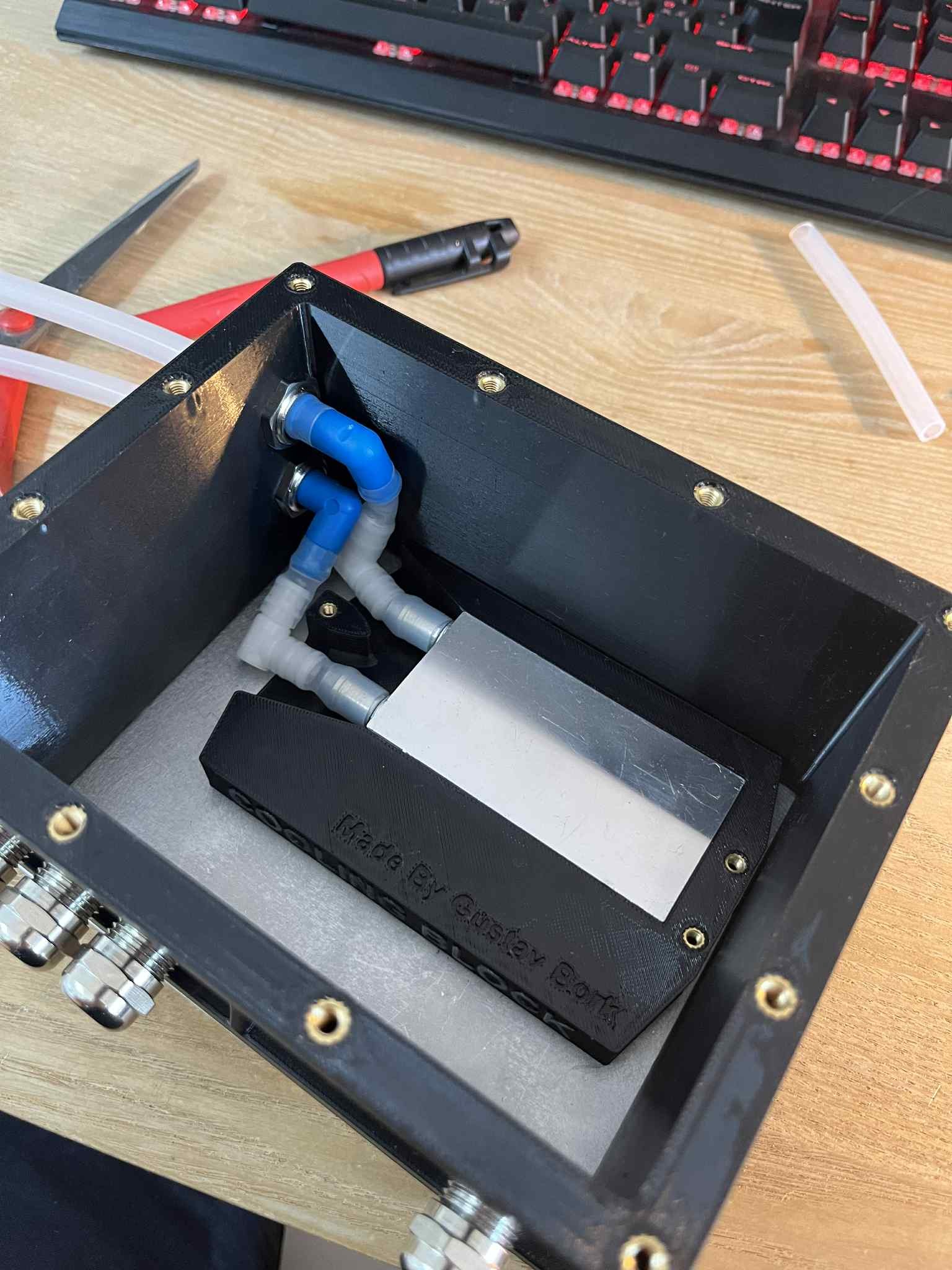 The VESC box is 3D printed with thin walls and no infill. I filled the internals between inside and outside walls with thin flowing epoxy, to create a 100-pct. waterproof enclosure. The top polycarbonate sheet is screwed down with M4 bolts and nuts with a 2mm silicone seal between. The VESC is cooled with a single water cooled heatsink, which works perfectly and never leaked.