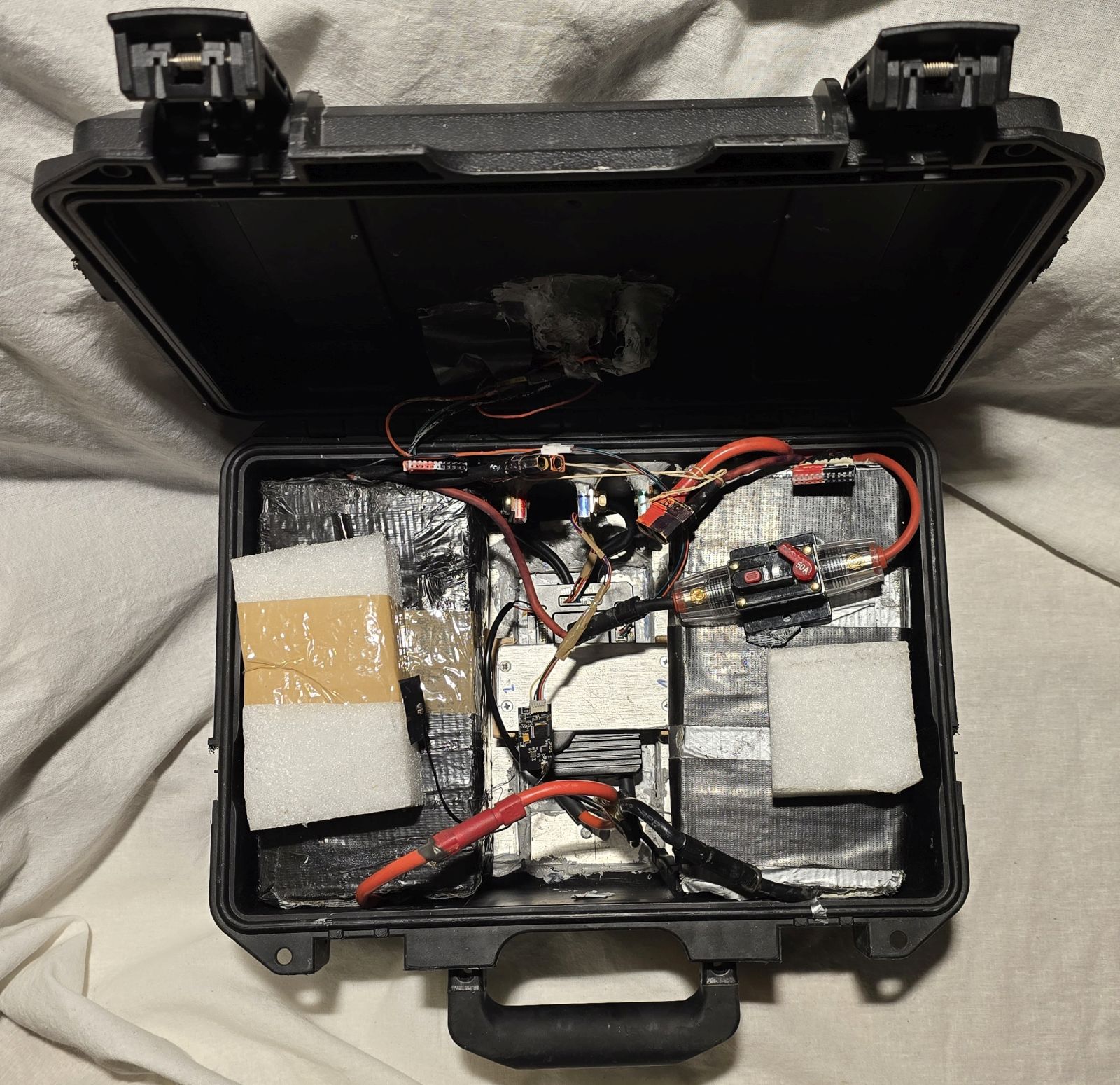I chose to put everything (Batteries, Controller) in a waterproof Photo-Suitcase from Amazon (LYcus HC-3310 ) and was impressed that it is 100% watertight even submerged. Very easy to build