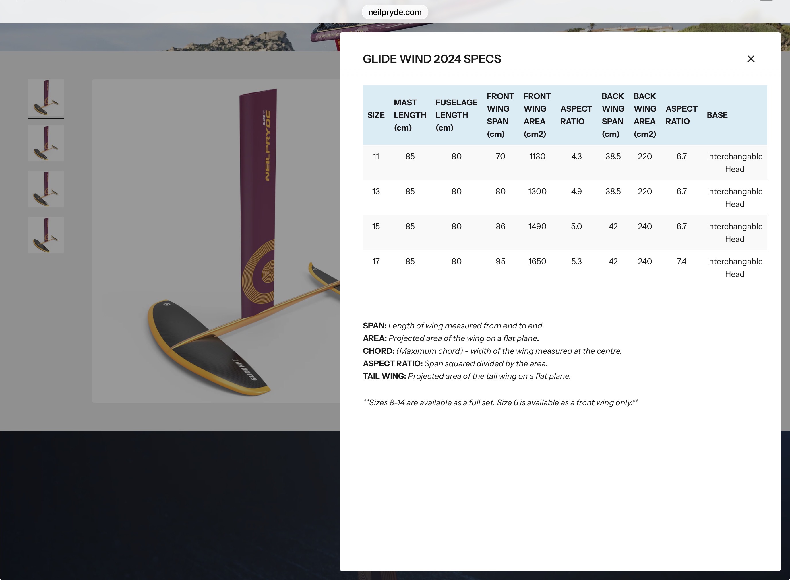 I have this foil from Neil Pryde. Front foil = 1602.2 cm2