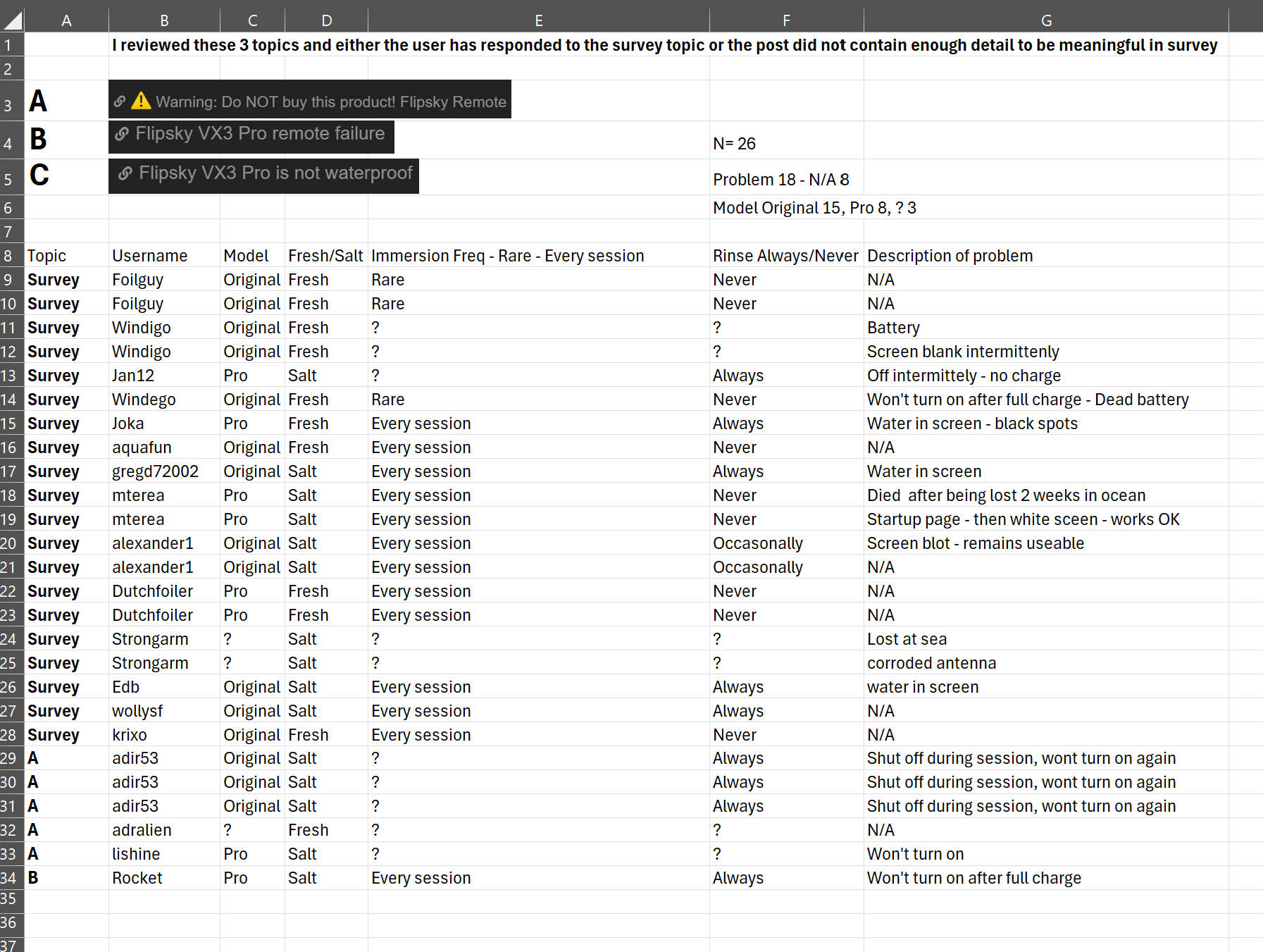 VX3 original for me 2 failures in fresh water. First one worked 2 or 3 times and failed it wonât turn on water got inside the battery. I am trying to fix it. Second one worked for a year and now the screen goes blank intermittently.