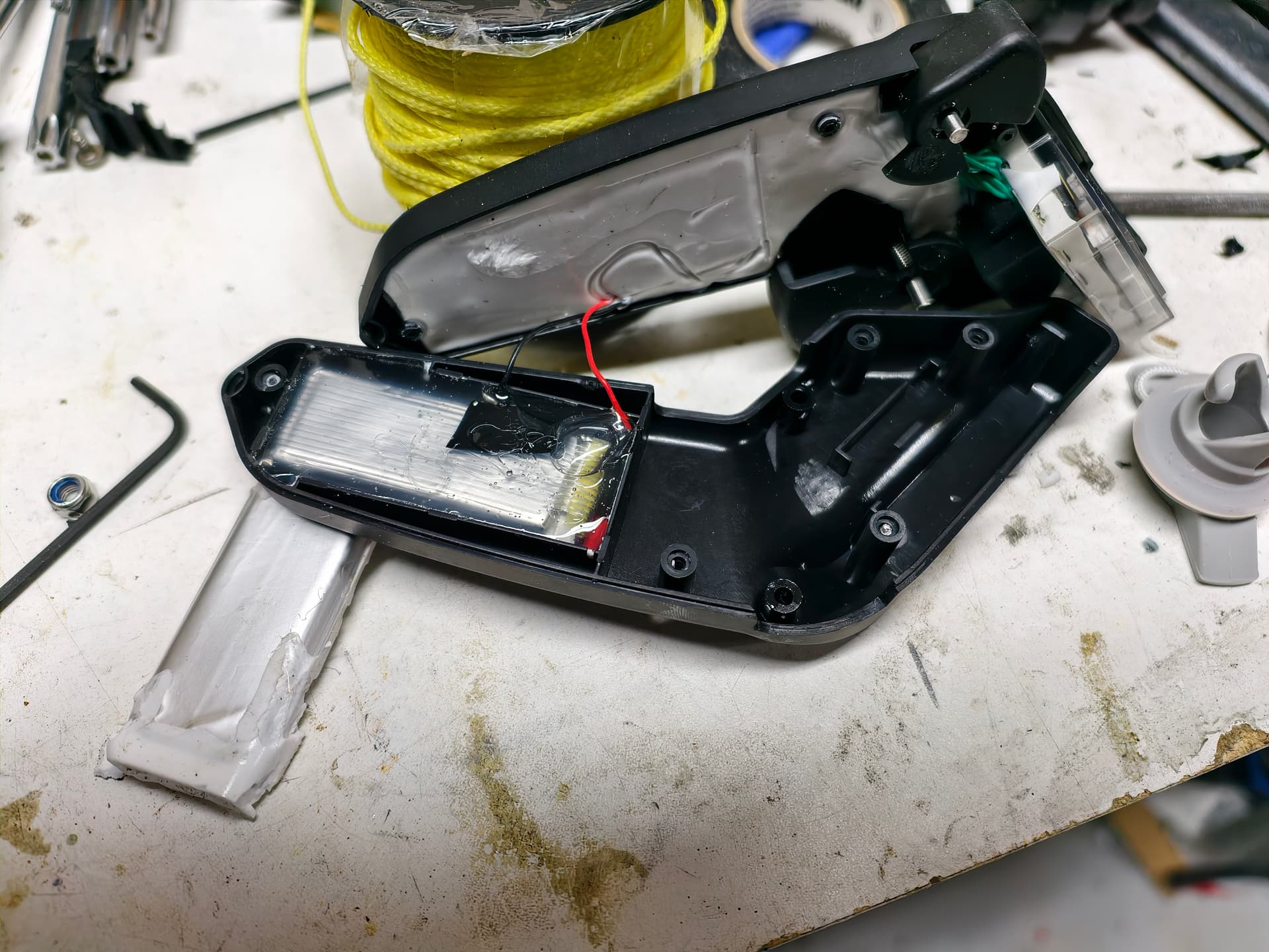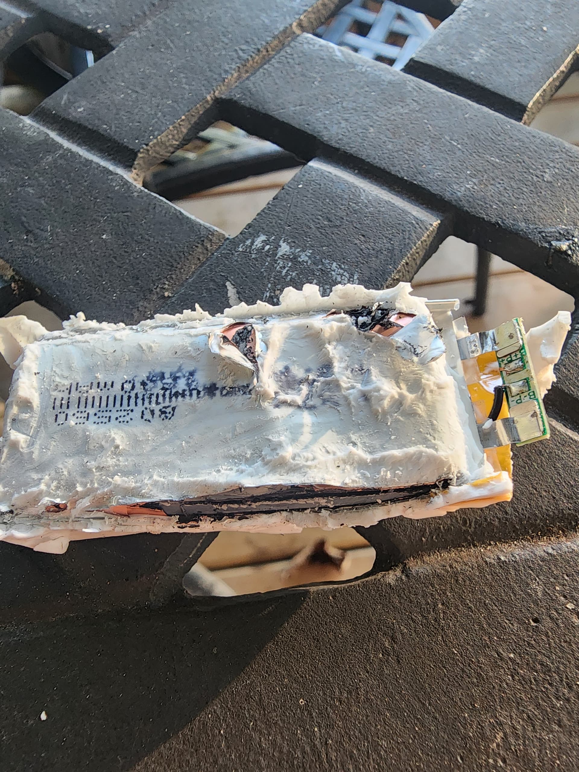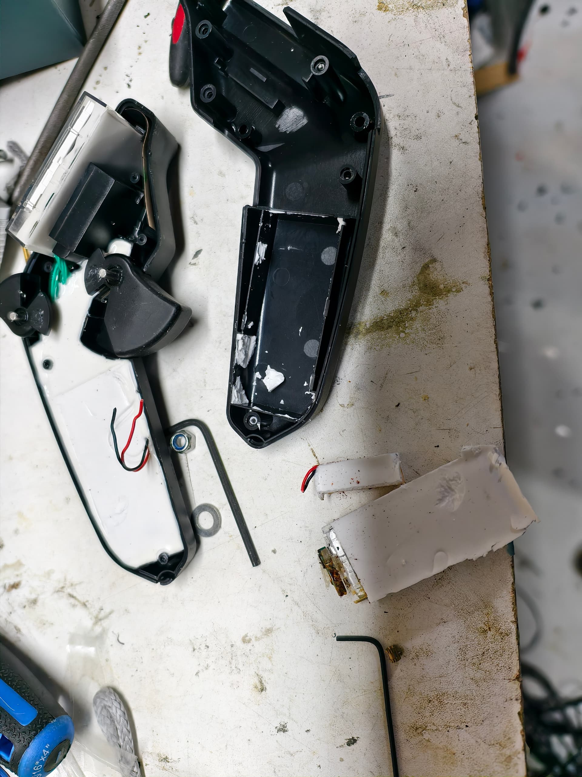 The battery is potted in with white silicone. I just ran a small screwdriver all around it to detach the silicone from the plastic body and pulled it out. I didn’t puncture the battery. Puncturing a charged battery could be dangerous but mine was dead 0V so probably safer that way. The silicone peeled off pretty easily with my fingers.