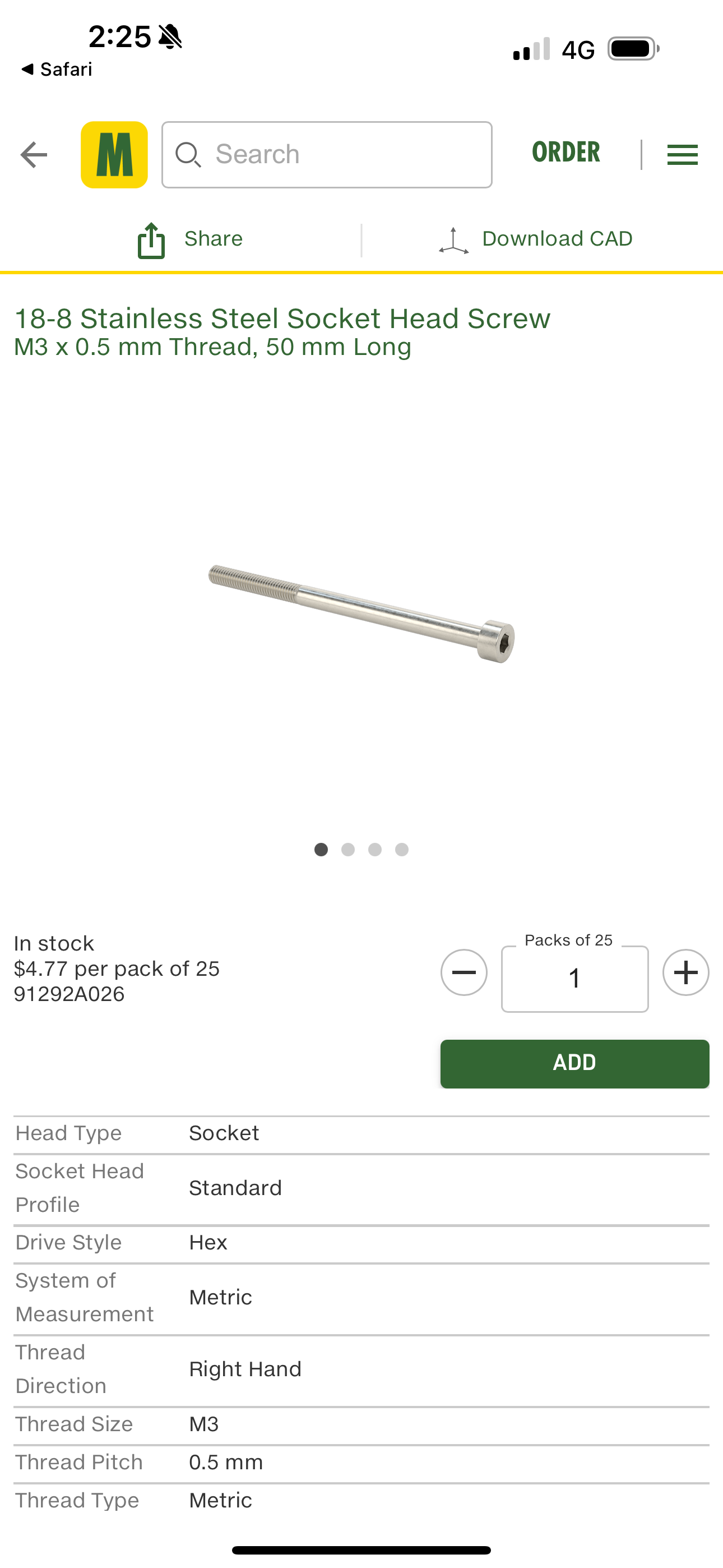 18-8 Stainless Steel Socket Head Screw M3 x 0.5 mm Thread, 50 mm Long