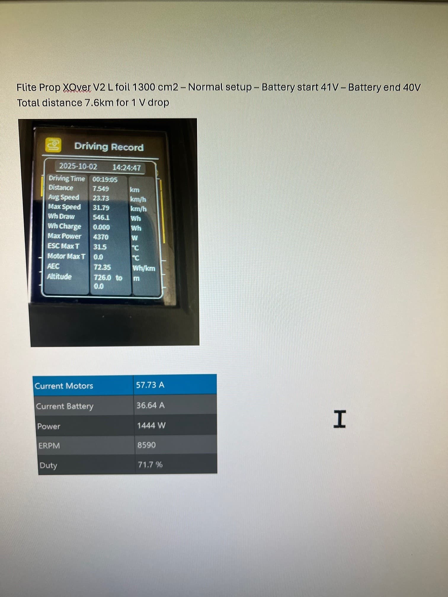 I then re-assembled my Flite prop and 1300 cm2 foil rig and went out with fresh 41V battery. Travelled 7.6km, top speed 31.8km/h and battery V at end of session and cool down was 40V - voltage drop 1V which is my normal performance level with this rig.