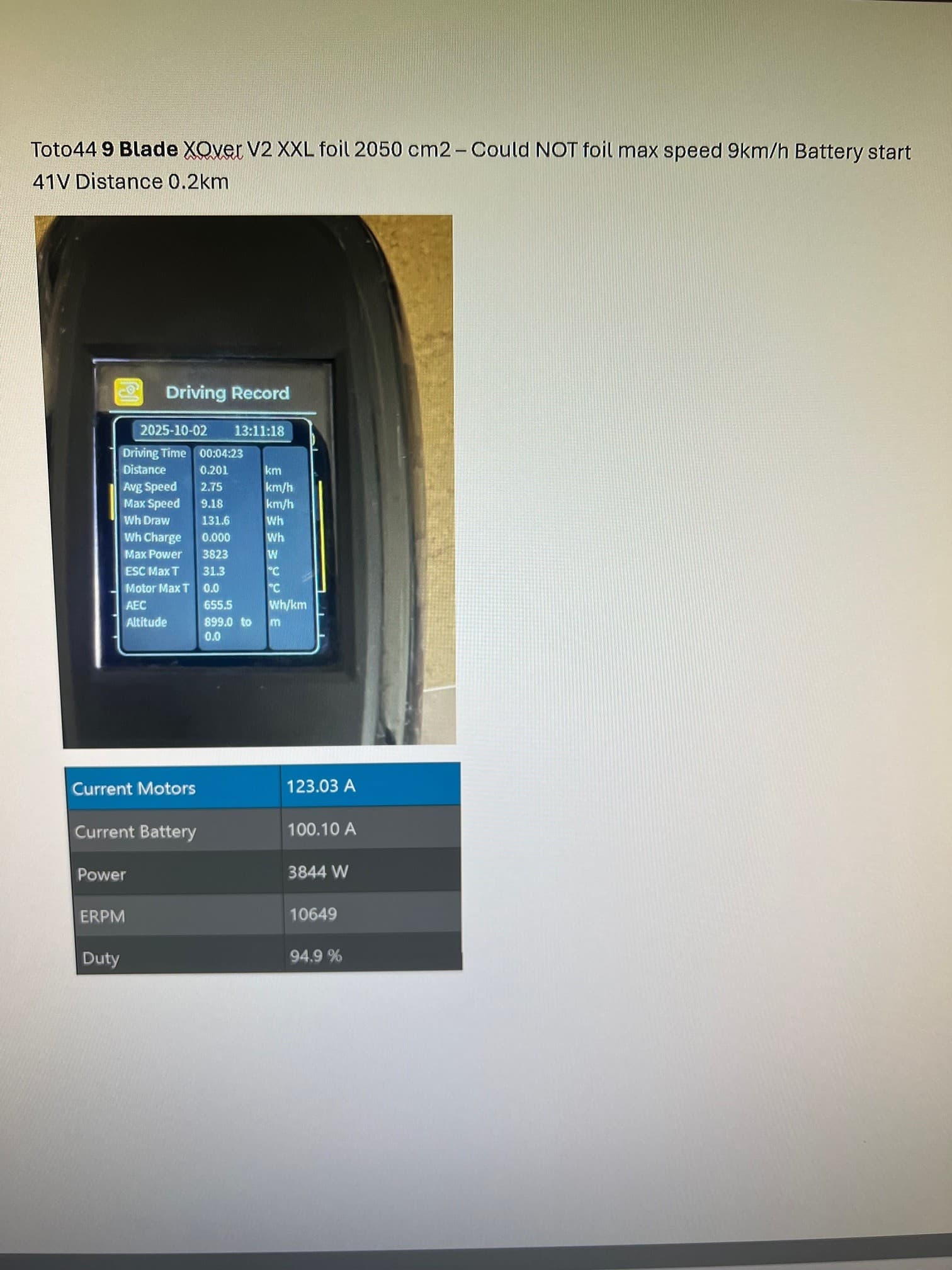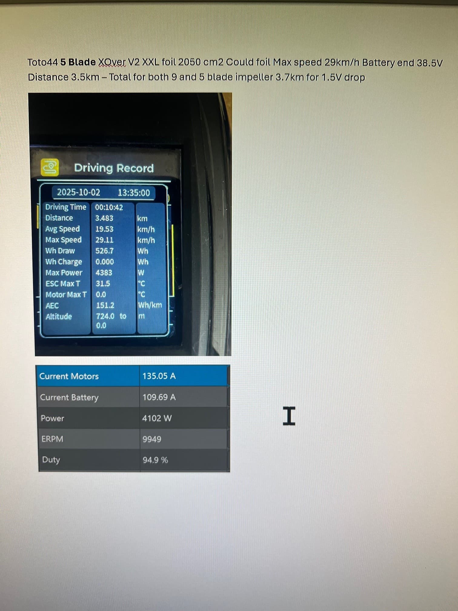 I traveled a total of 3.7km for both impellers with a top foiling speed of 29km/h (possibly limited by foil size but I was at WOT) Battery V at end of session and cool down was 38.5 - So power hungry 2.5V drop relative to my normal setup. Likely because I was at WOT most of the time.