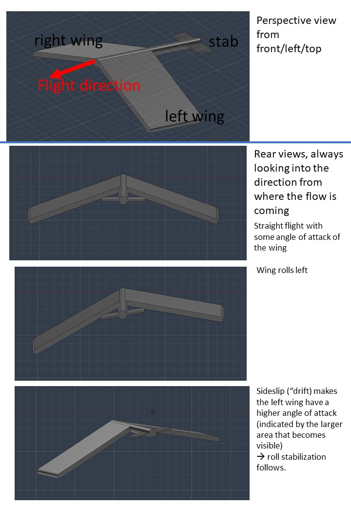 This behaviour mirrors what happens in aircraft. A dihedral wing allows an aeroplane to turn using rudder alone: deflecting the rudder left yaws the nose left and creates sideslip from the right. With positive dihedral, that sideslip increases the angle of attack on the right wing, rolling the aircraft into the turn. Roll and Yaw are therefore positively coupled for dihedral wings, and negatively coupled for anhedral wings (making anhedral wings stable on roll).