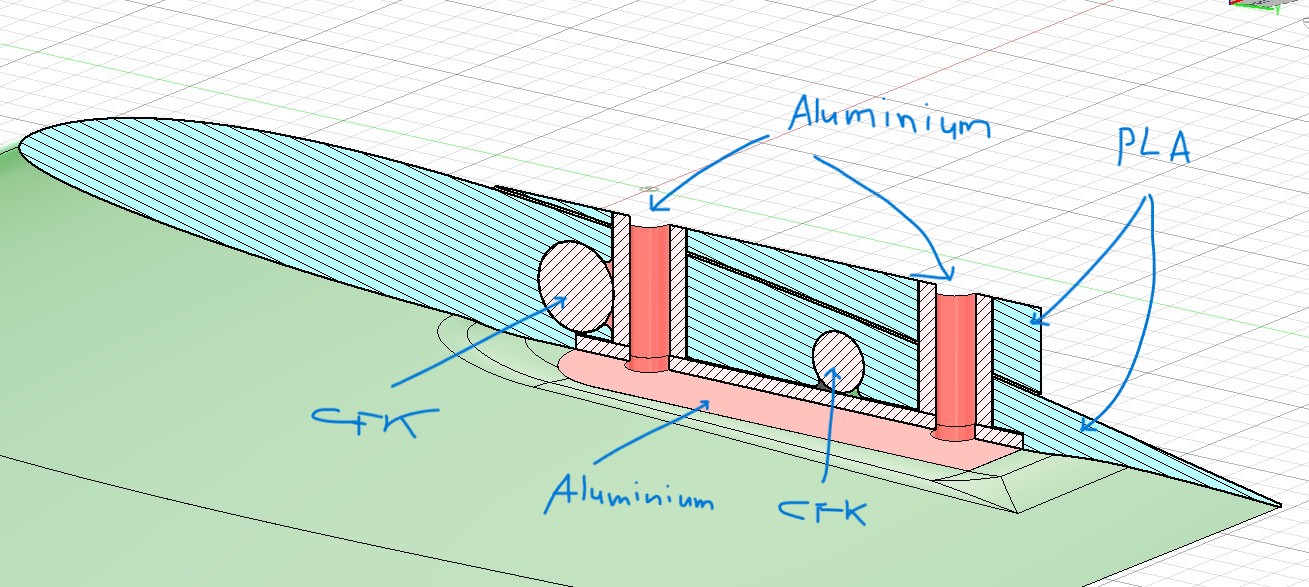 On my finished wing, I am using just a single layer of glass (approx. 160 g/m²), and a few very thin carbon rovings. I am a beginner, so the are no sudden changes in angle of attack that would stress the wing too much. But how is the wing centre designed in commercial wings? I attached a screen shot of my design. I have some thick carbon rods along the wing, some thick aluminium tubes that take the bolts, and an aluminium plate on the underside. Everything covered with an extra layer of 160 g/m² carbon. All this is embedded in 100% infill PLA+. It feels very stiff.