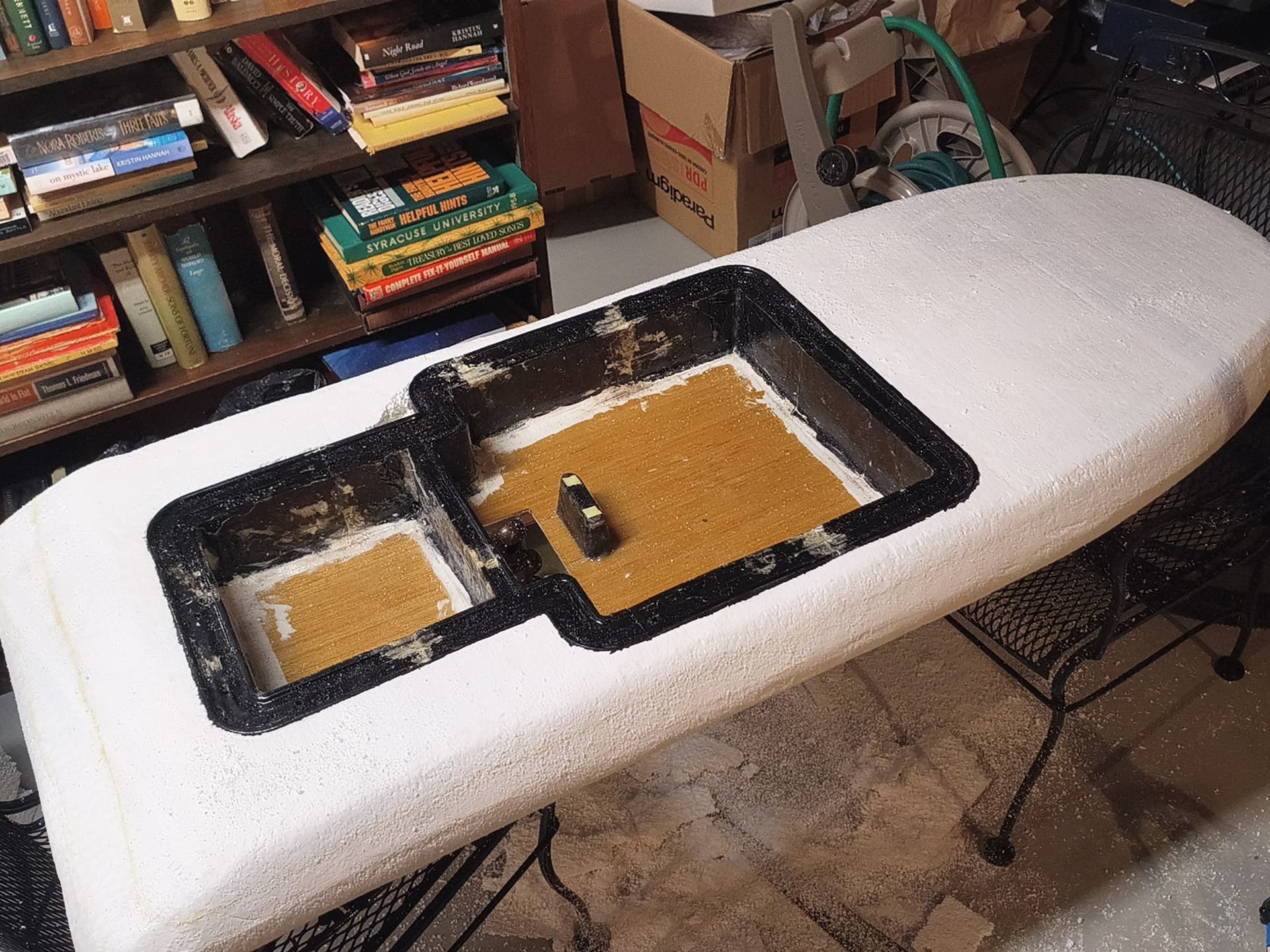 Got the board shaped and sanded! Used a hack saw to shape the outline of the board and then sanding screen from Greenlight surf shop for sanding the rails. Used EPS sealer to fill in voids, theres still some due to crappy sealing on my part but should be fine. 3d printed the walls for the electronics enclosures and need to sand and put them together.