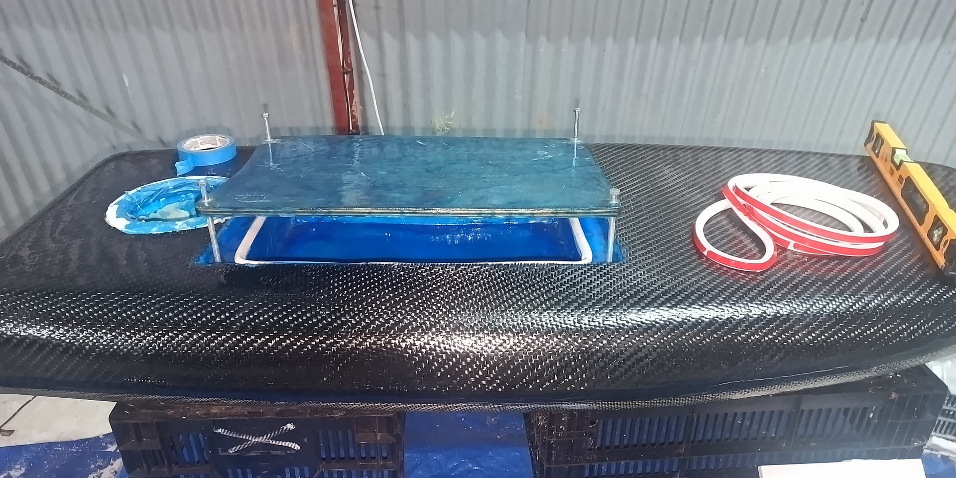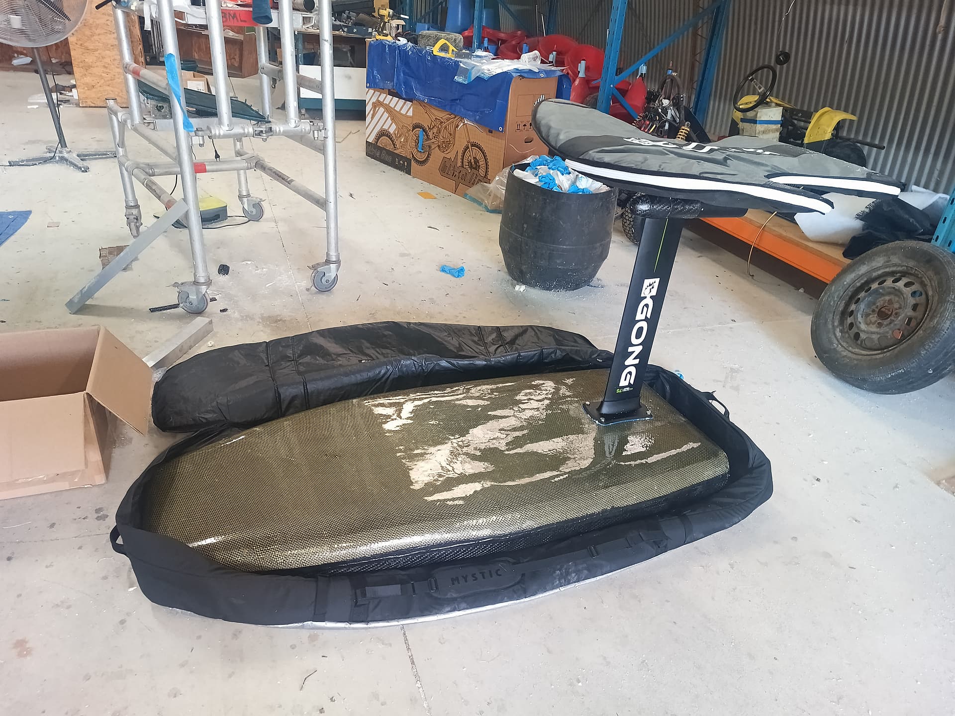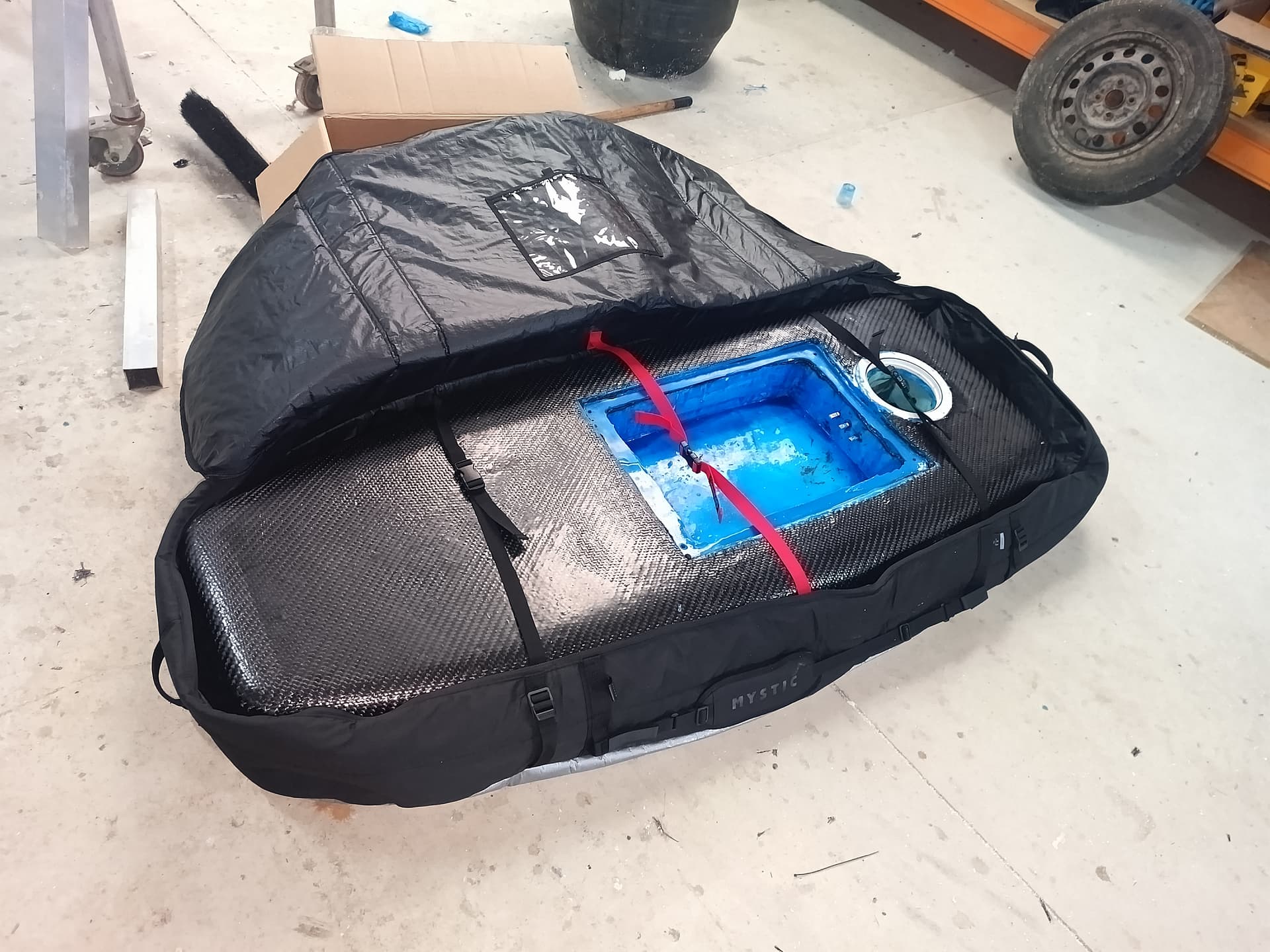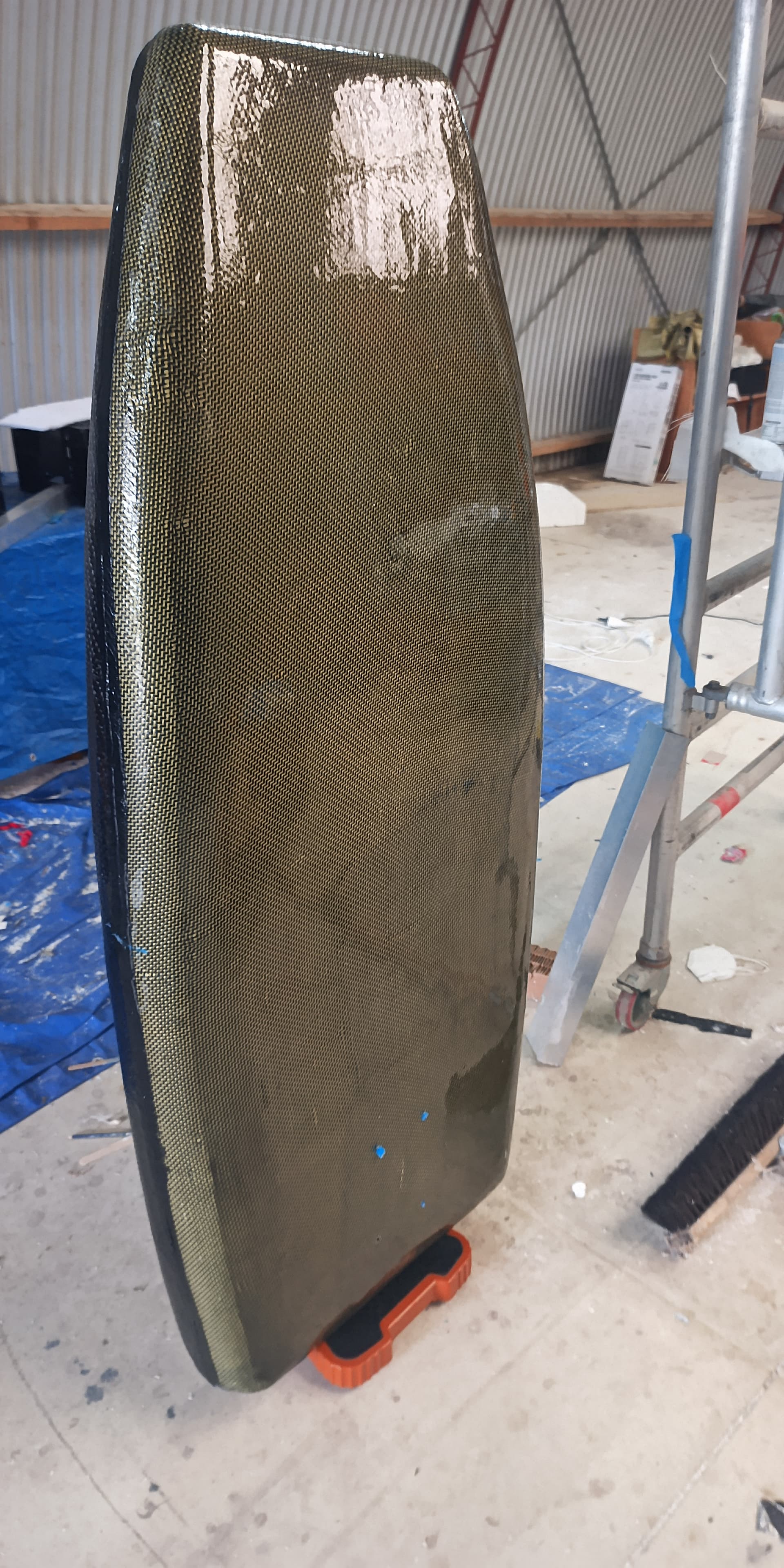 Used carbon fiber reinforced plywood as a sort of half stringer to reinforce the foil box area and distribute the load, board has 380gsm carbon on top and 200 gsm carbon fiber kevlar on the bottom.