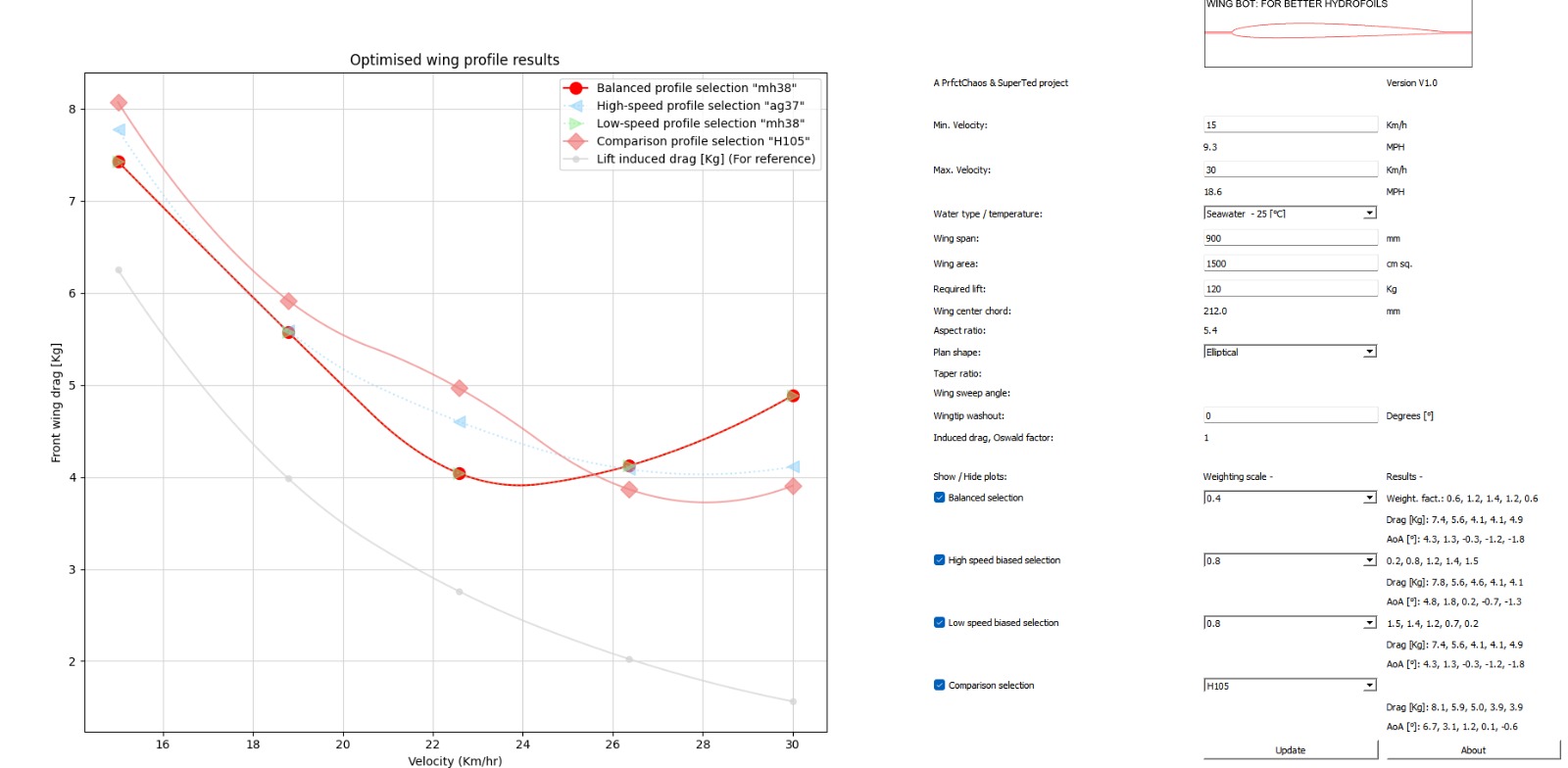 For a beginner pump foil, I would choose a profile with a slower max efficiency speed than 28km/h (H105). Would be good to be able to reach that max efficiency speed, 28km/h is (too) fast for pumpfoiling, at leas for a beginner. Around 20km/h seems more realistic.