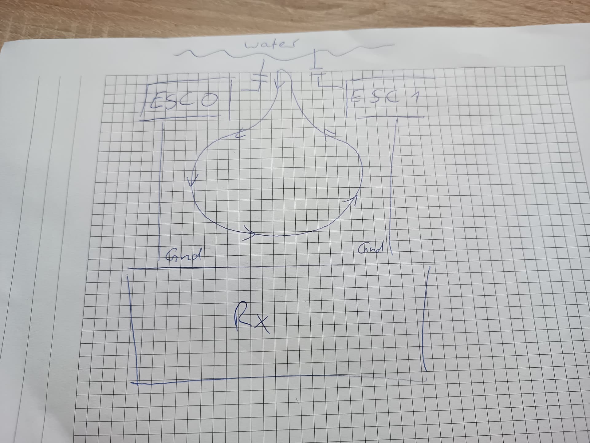 The ESCs couple capacitively to the water through motor and wires. This current will disturb the very low voltage on the signal wire by inducing a voltage on the thin GND wires between Rx and ESCs. Thats why only one motor at a time works well.
