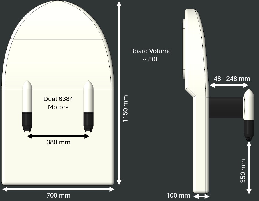 I am working currently on my second tow boogie since my first on with a single 65161 + Rudder drives like an crazy horse. I am more fighting with it to go in a straight line than enjoying the ride. Here is what i came up with for now. I am limited in size by what i can fit into my car. I am planning to make the masts height adjustable for ease of transportation and fine tuning. Battery will be a 12S6P 21700 in the front. What do you guys think could this work?