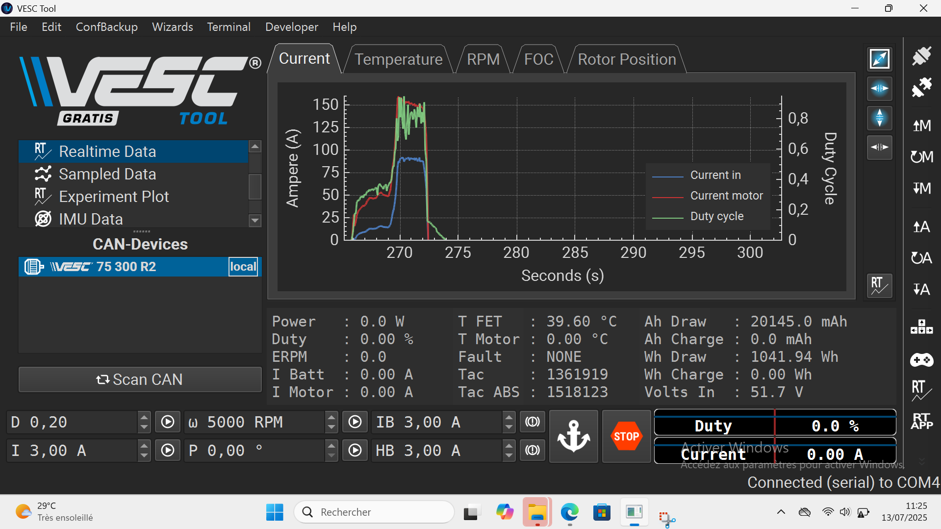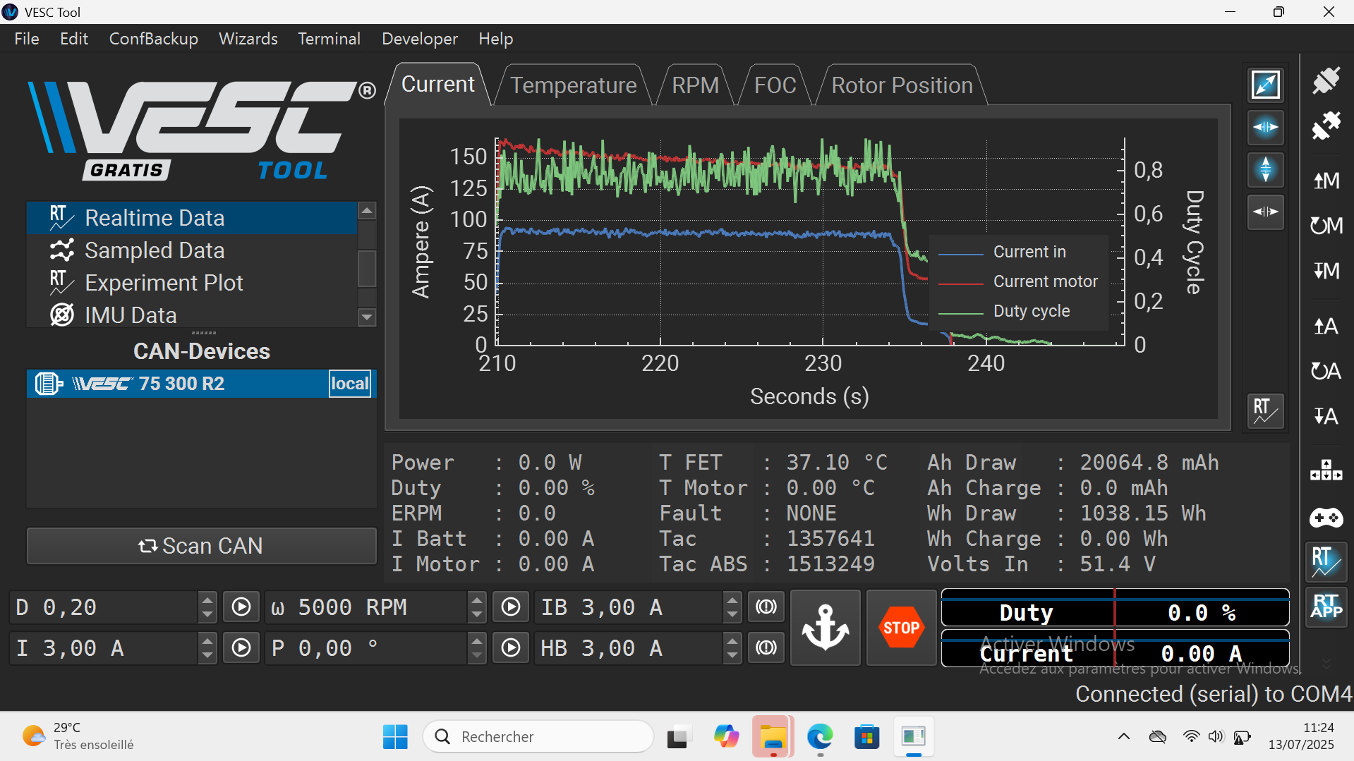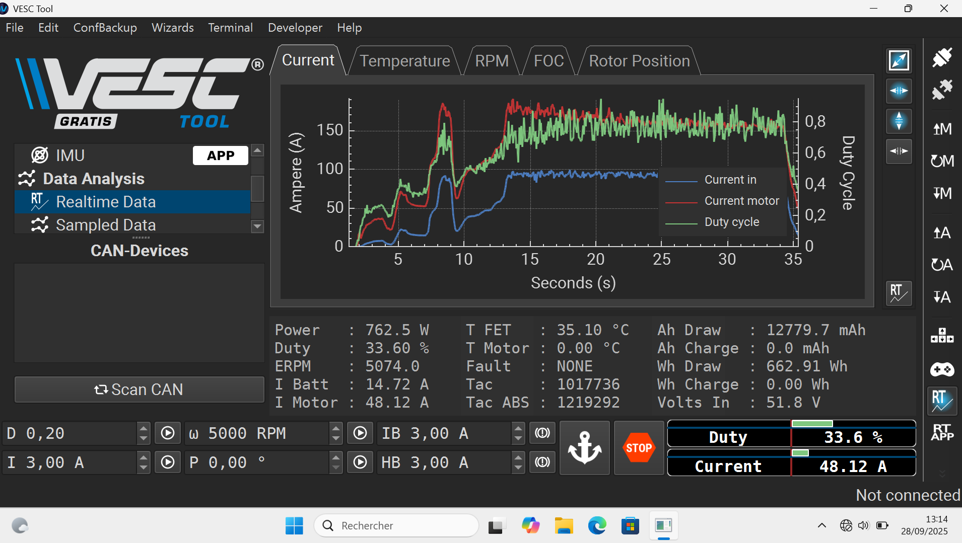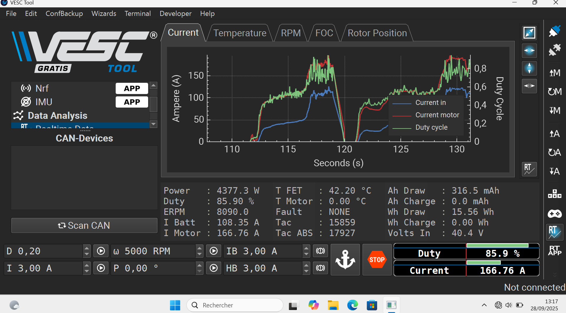 The system is setup at 300A phase and 175A battery, and I could see no other limitations than the prop based on the settings and duty cycle.