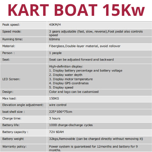 A full electric mini kart racing boat, 2.25 long x 1 m wide, 15kw electric power, 60Wh battery …13k€ tax included.